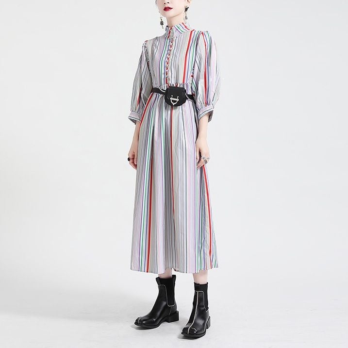 大きく膨らむパフスリーブに高い位置のウエストに切り返しなどシルエットが美しい、スタンドカラー・7分袖・膝下丈のシャツワンピースです。マルチカラーのストライプやボタンがキュートな、レトロな雰囲気のおしゃれアイテムです。