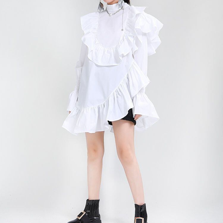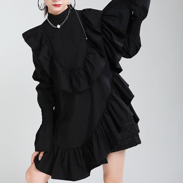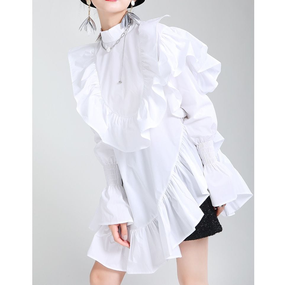 フリルを豪華にあしらったアシンメトリックなシルエットが目を惹く、ハイネック・長袖・イレギュラーヘムのブラウスシャツです。シャーリングで作られたキャンディスリーブがキュートな、イベントやちょっとしたパーティにも使えるアイテムです。ブラックとホワイトの2色から選べます。