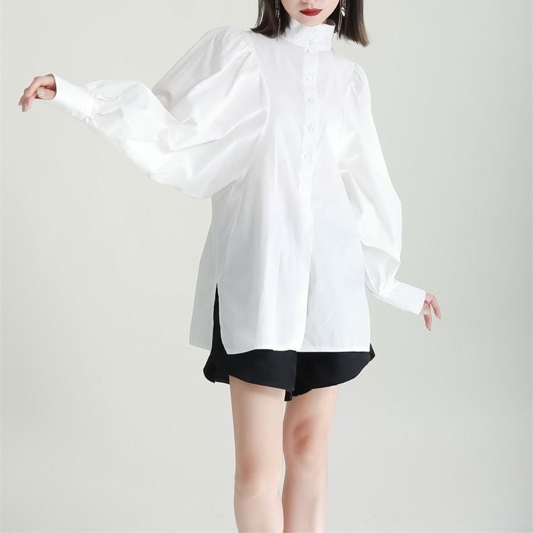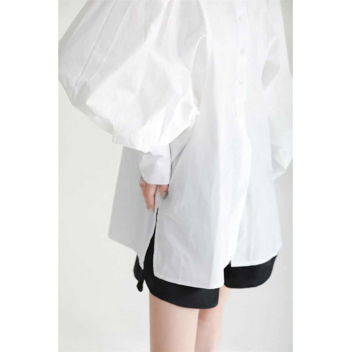 STAND COLLAR SOLID PUFF SLEEVES DESIGN SHIRT 2colors M-11818