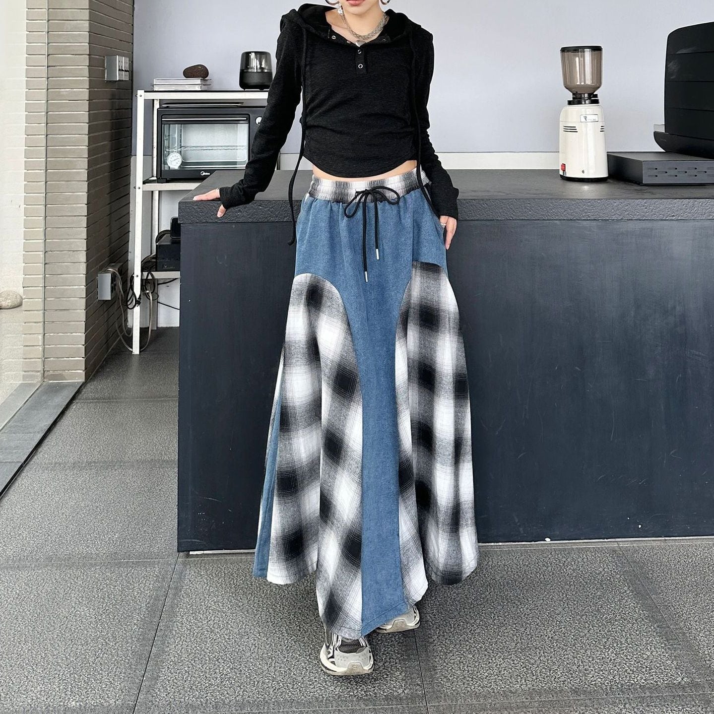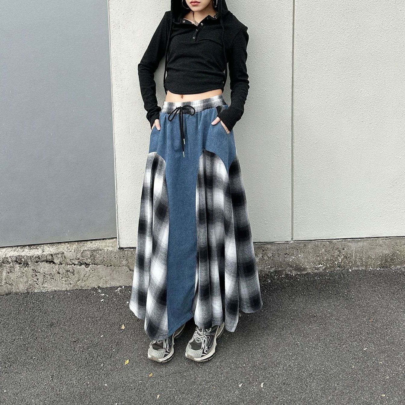 チェック柄とブルーデニムのコントラストスティッチデザインがキュートな、Aライン・ロング丈のカジュアルスカートです。ウエストはゴム+ドローストリングで、履き心地が良いです。コーディネートの主役になる目を惹くアイテムです。