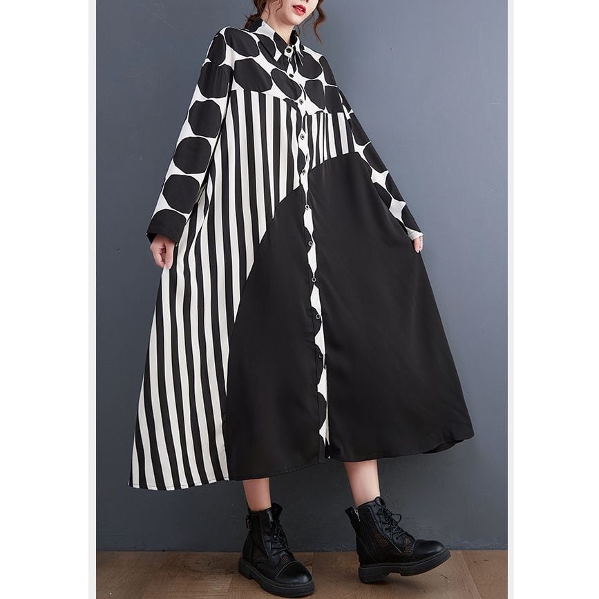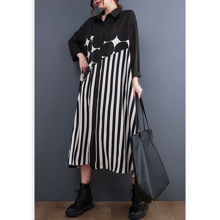 モノトーンのドットやストライプのスティッチがお洒落な、ポロ襟・長袖・膝下丈のシャツワンピースです。ゆったりとしたAラインのシルエットが、エレガントな印象のアイテムです。2種類から選べます。