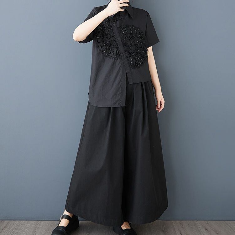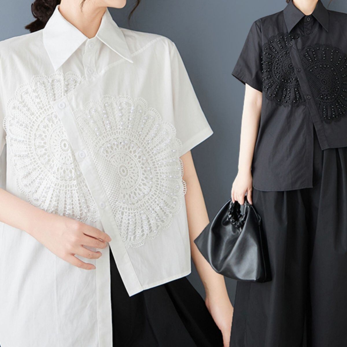 ビーズとレースでできたフラワーモチーフのスティッチがキュートな、ポロ襟・半袖・イレギュラーヘムのデザインシャツです。アシンメトリックなシルエットが特徴的な、単色で合わせやすいアイテムです。ブラックとホワイトの2色から選べます。