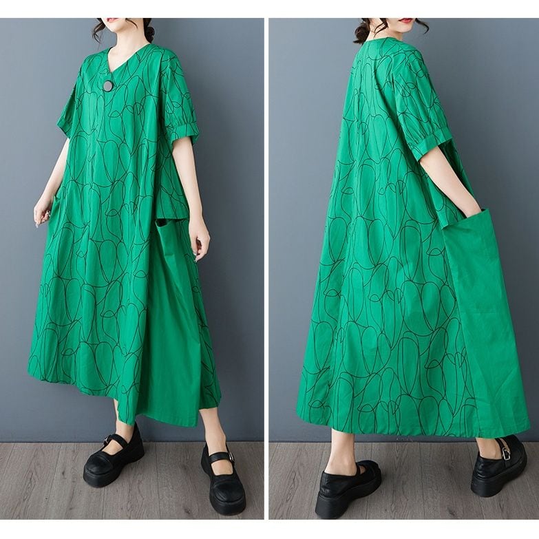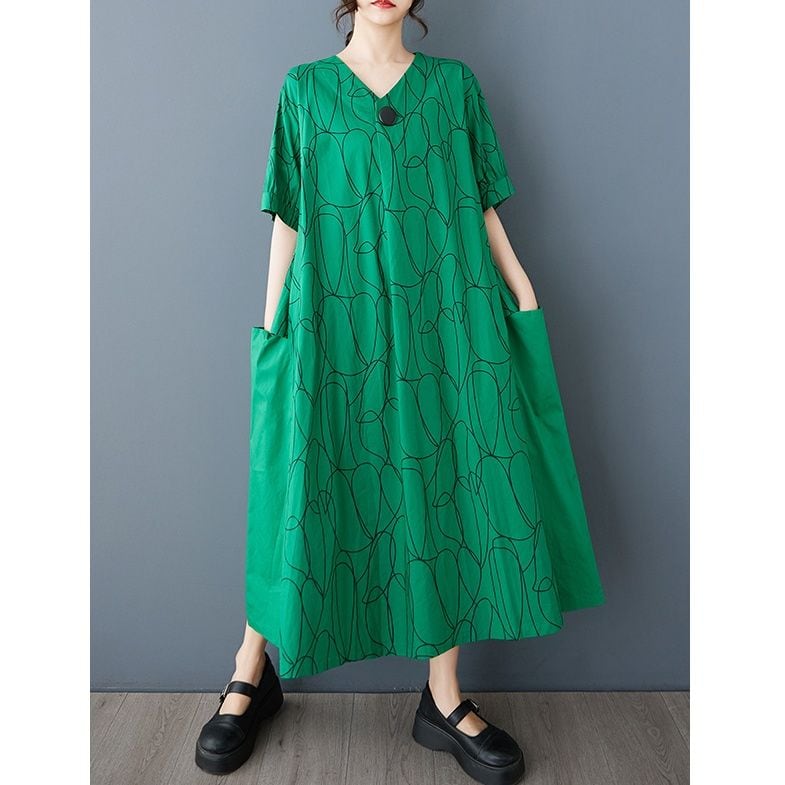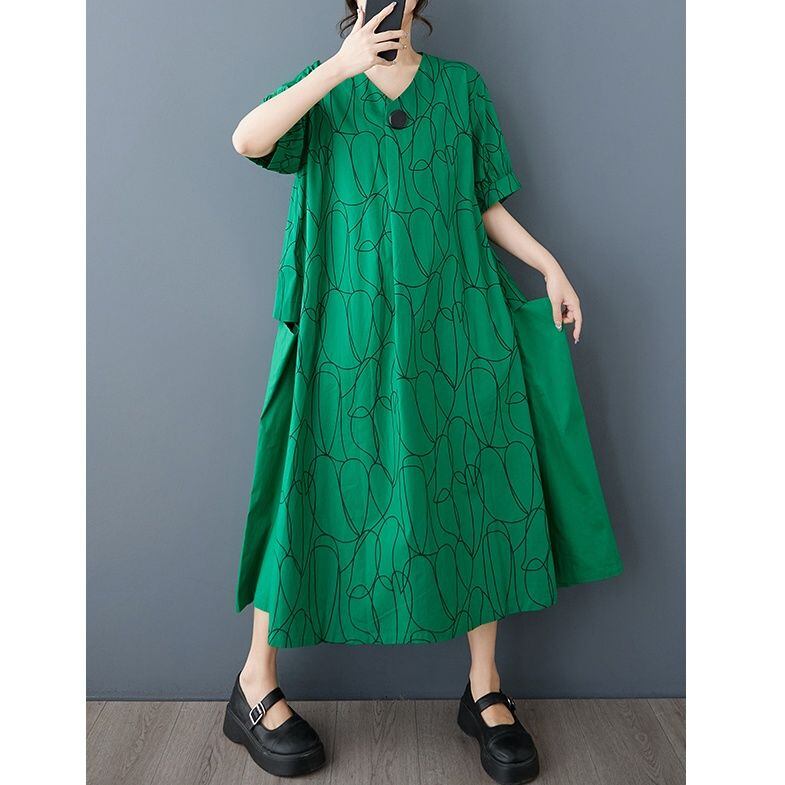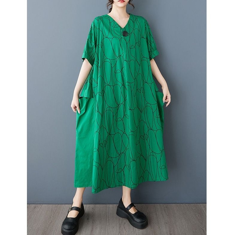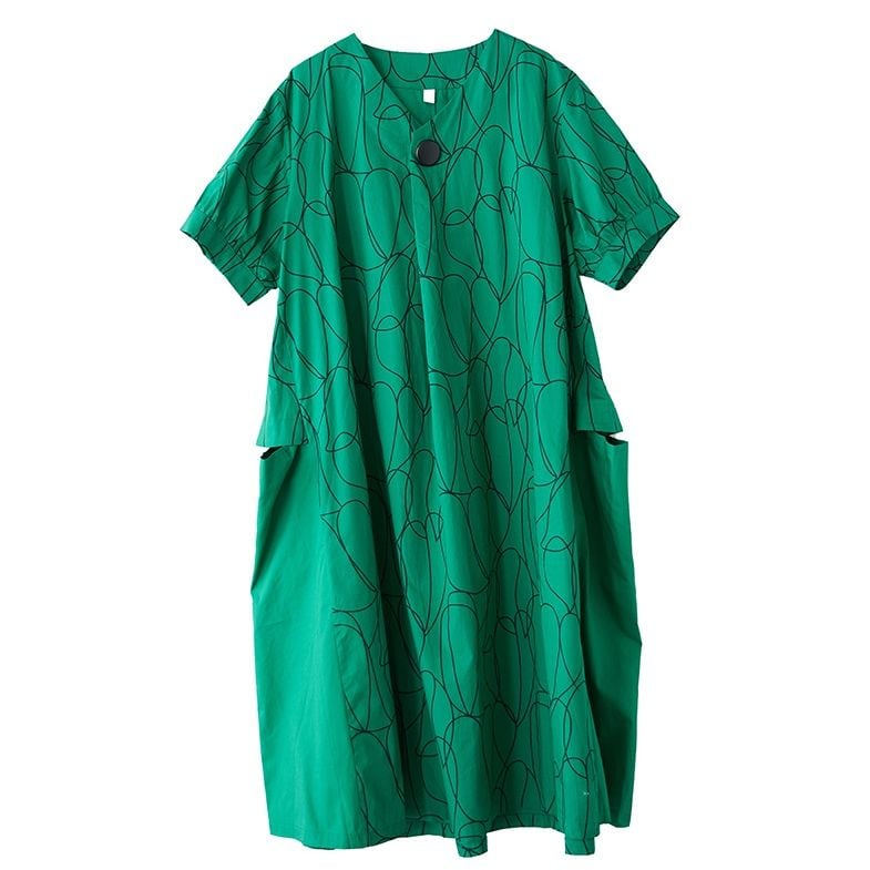鮮やかなグリーンの柄生地が目を惹く、Vネック・半袖・ロング丈のプルオーバーワンピースです。大きなボタン飾りやサイドのデザインポケットがアクセントになった、ゆったりとしたシルエットのカジュアルアイテムです。