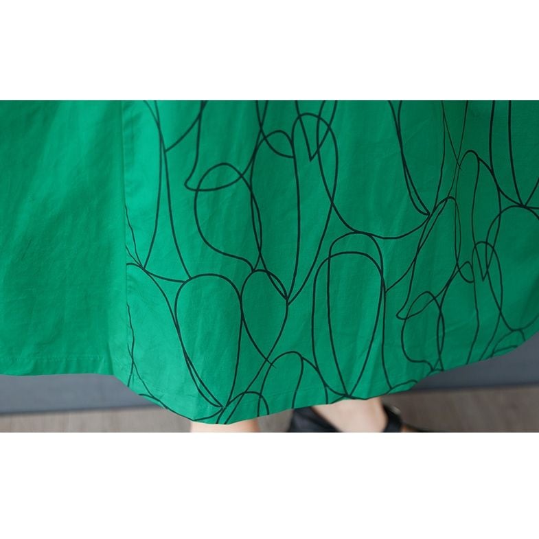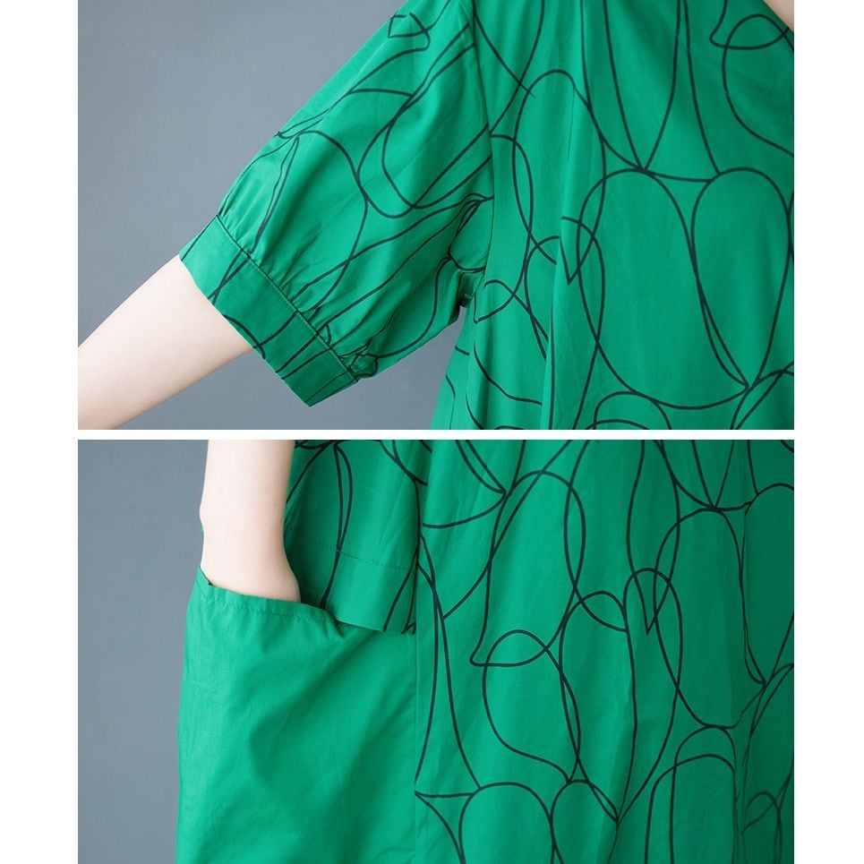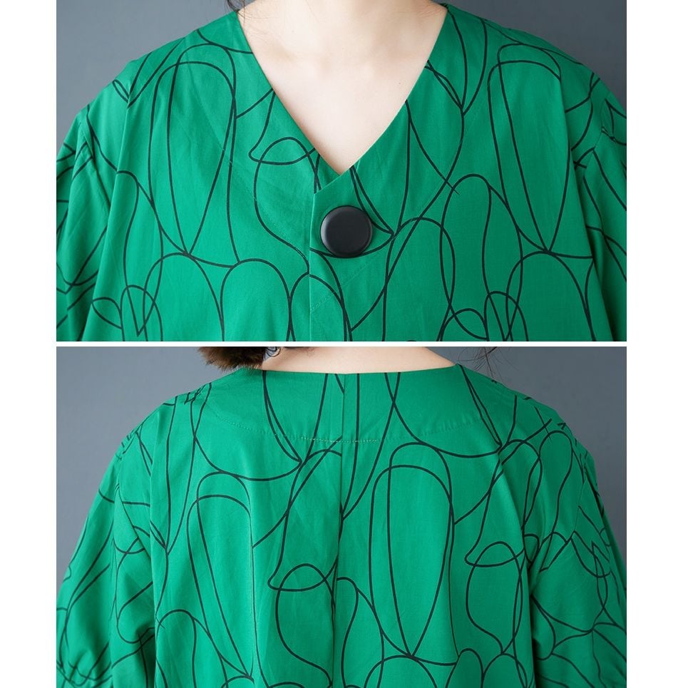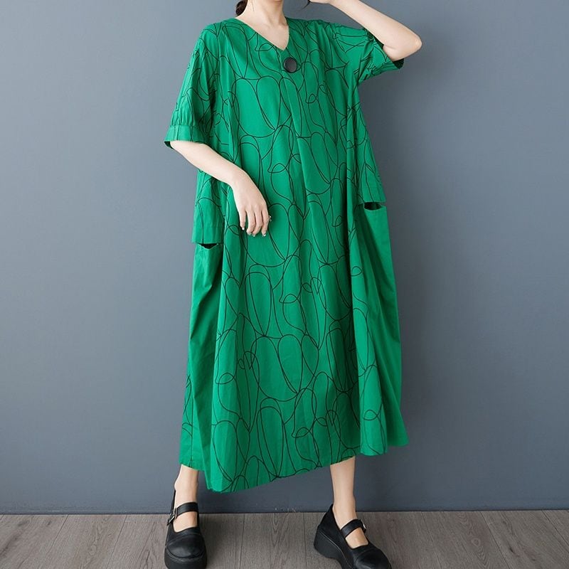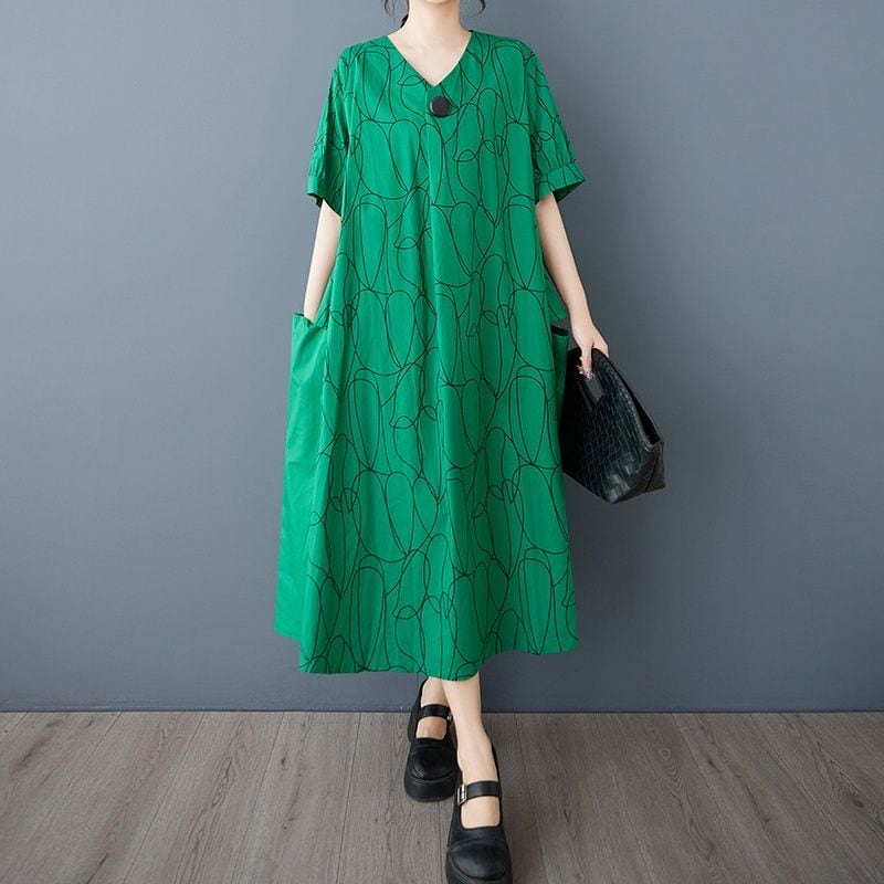 鮮やかなグリーンの柄生地が目を惹く、Vネック・半袖・ロング丈のプルオーバーワンピースです。大きなボタン飾りやサイドのデザインポケットがアクセントになった、ゆったりとしたシルエットのカジュアルアイテムです。