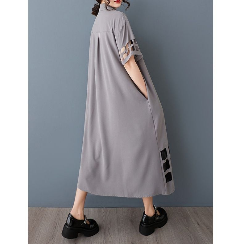 正方形の切り抜きが並んだ袖や裾のデザインがお洒落な、ポロ襟・半袖・ミドル丈のシャツワンピースです。裾の切り抜きはメッシュでスティッチされ、透け感のあるデザインが涼し気で目を惹きます。ブラックとグレーの2色から選べます。