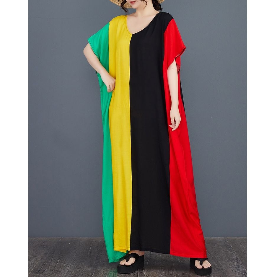 ラスタカラーのストライプが目を惹く、Vネック・半袖・マキシ丈のプルオーバーワンピースです。ゆったりとしたワイド幅のシルエットが、エレガントでリラックスした雰囲気のアイテムです。