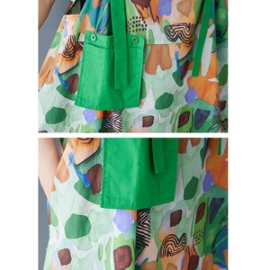 ポップなイラストプリント生地とグリーンのコントラストデザインがキュートな、Aライン・膝下丈のジャンパースカートです。ショルダーストラップはボタンで長さを調節できます。デザインポケットがアクセントになった、コーディネートの主役になる目を惹くアイテムです。