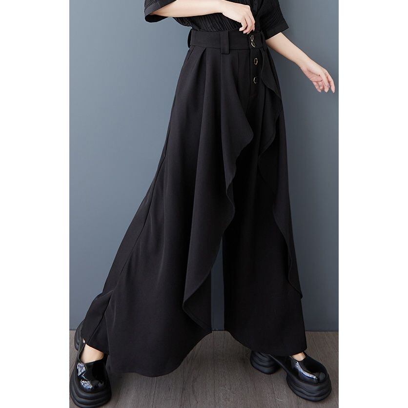 大きなボタンやウェイビーなフラップ飾りがお洒落な、ブラックのワイドレッグパンツです。ウエストはバックの一部がゴムなので、シルエットが美しく履き心地が良いです。オンでもオフでも使える、上品で都会的な印象のアイテムです。