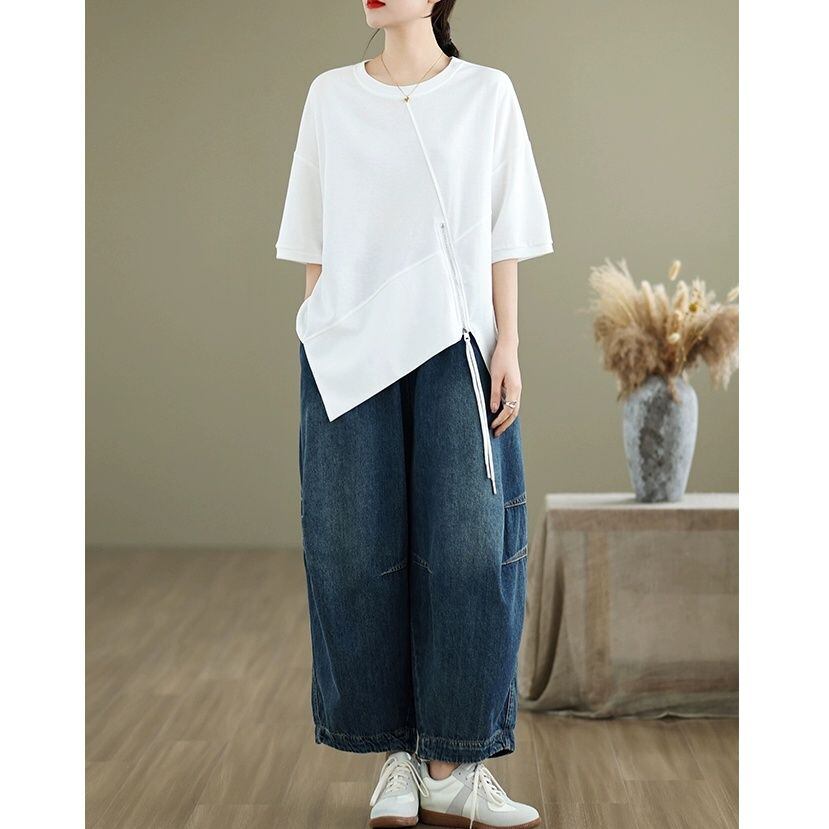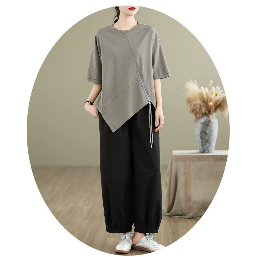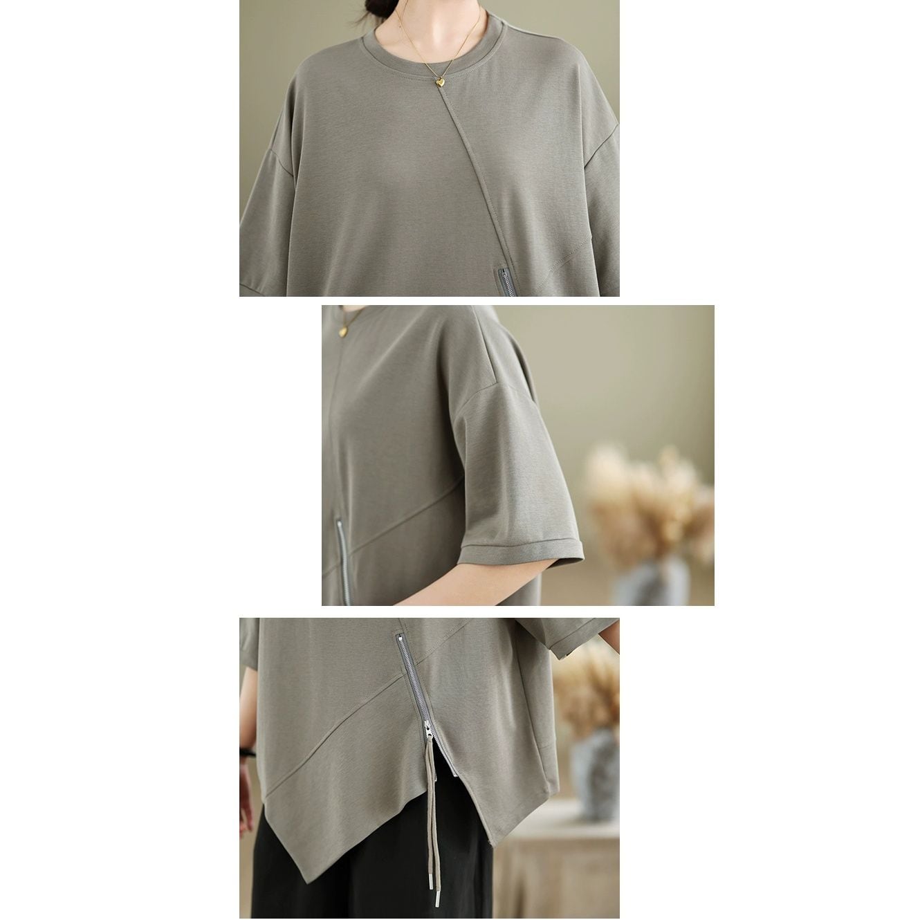 SOLID ZIP TRIMMED IRREGULAR HEM DESIGN T-SHIRT 3colors M-13494