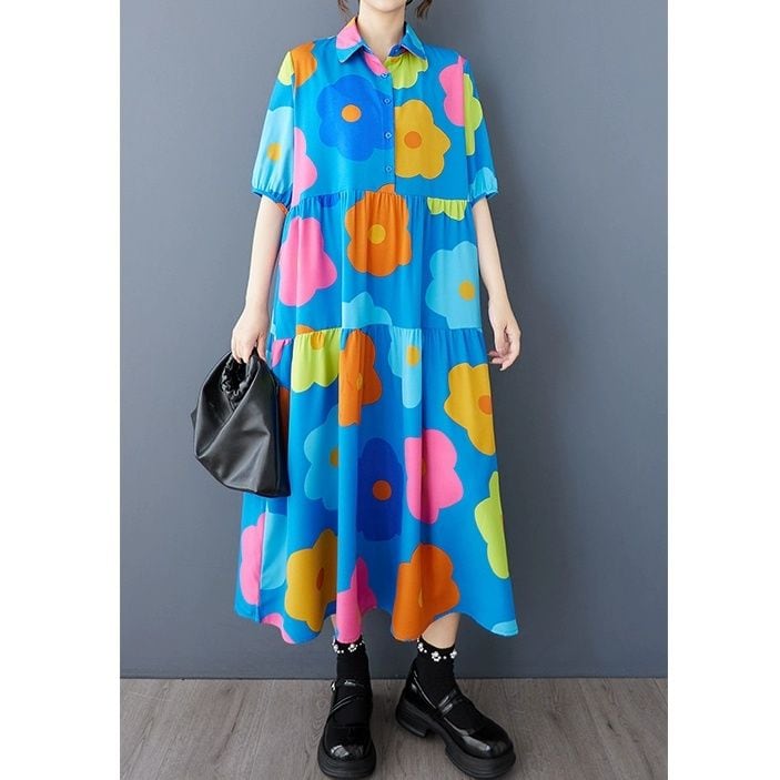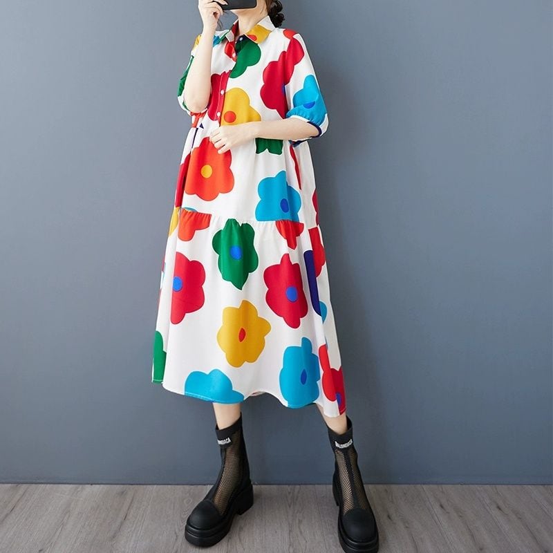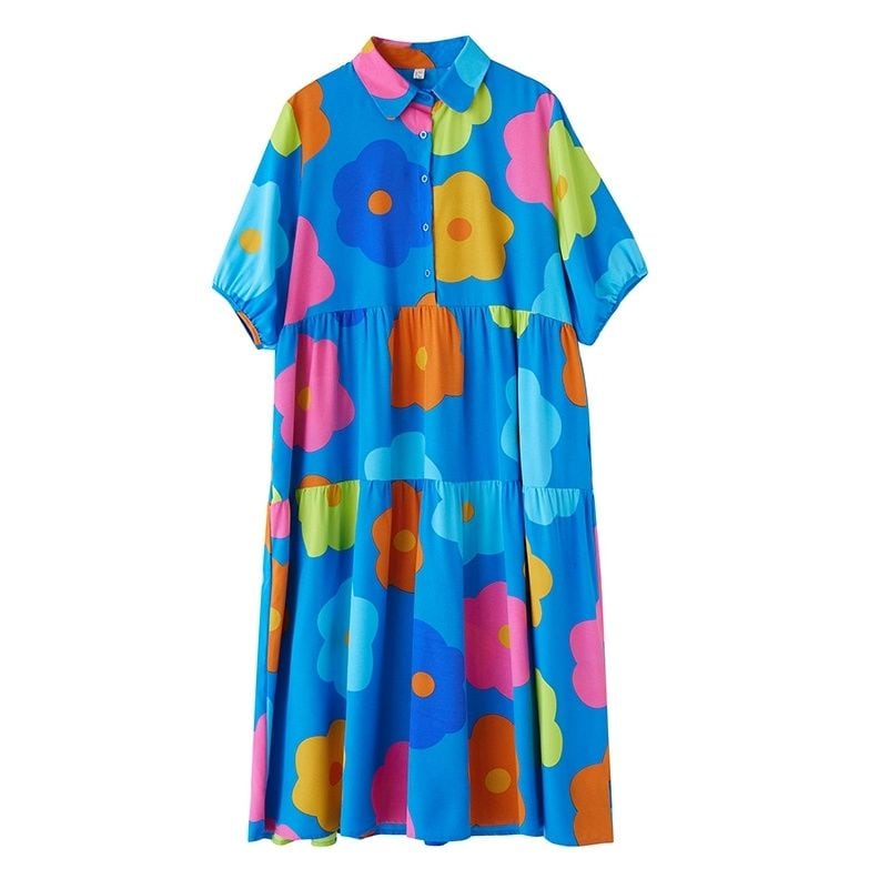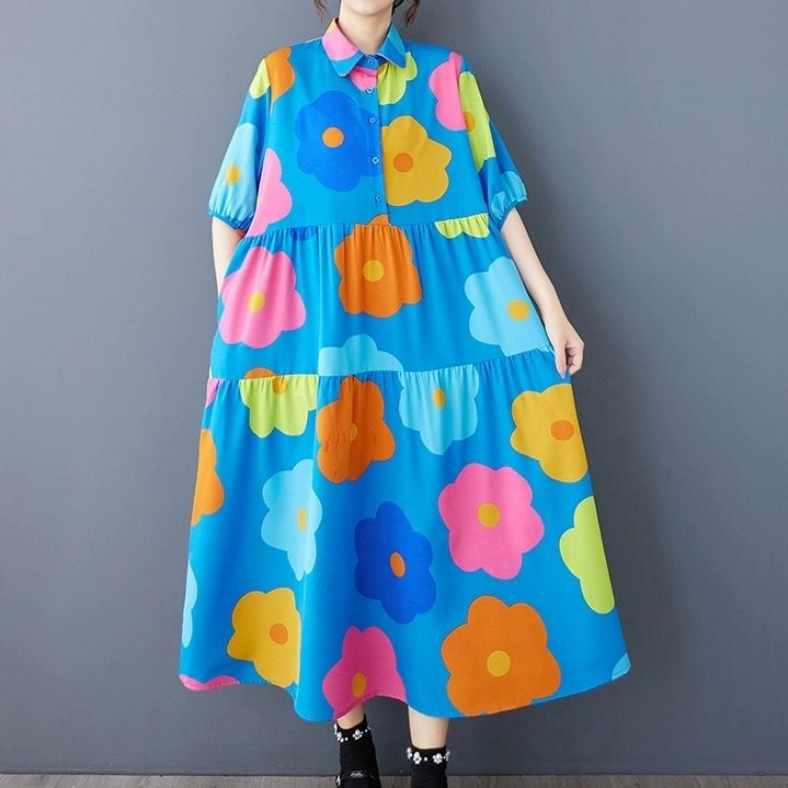 大きくてカラフルな花柄がキュートな、ポロ襟・ハーフボタン・5分袖・膝下丈のシャツワンピースです。ゆったりとしたティアードデザインのAラインシルエットで、鮮やかなカラーが目を惹くカジュアルアイテムです。ホワイトとブルーの2色から選べます。