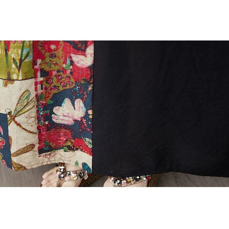 着物や浴衣のようなレトロな柄生地が美しい、Vネック・ハーフスリーブ・マキシ丈のプルオーバーワンピースです。アシンメトリックなデザインのゆったりとしたシルエットが、エレガントでリラックスした雰囲気のアイテムです。