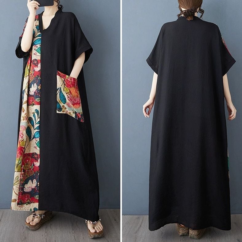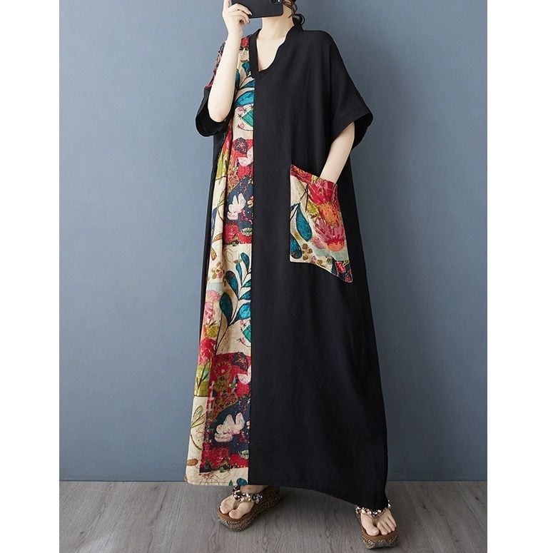ASYMMETRIC DESIGN V-NECK HALF SLEEVES PULLOVER MAXI DRESS 1color M-13523