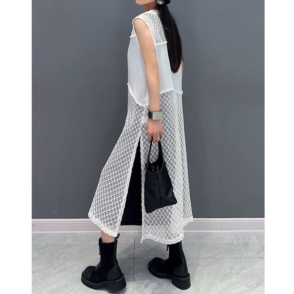 滑らかな素材でできた胸からお腹のスティッチがアクセントになった、ラウンドネック・ノースリーブ・ロング丈のメッシュワンピースです。広がりすぎないAラインのシルエットで、サイドは深いスリットが入っています。ブラックとホワイトの2色から選べます。