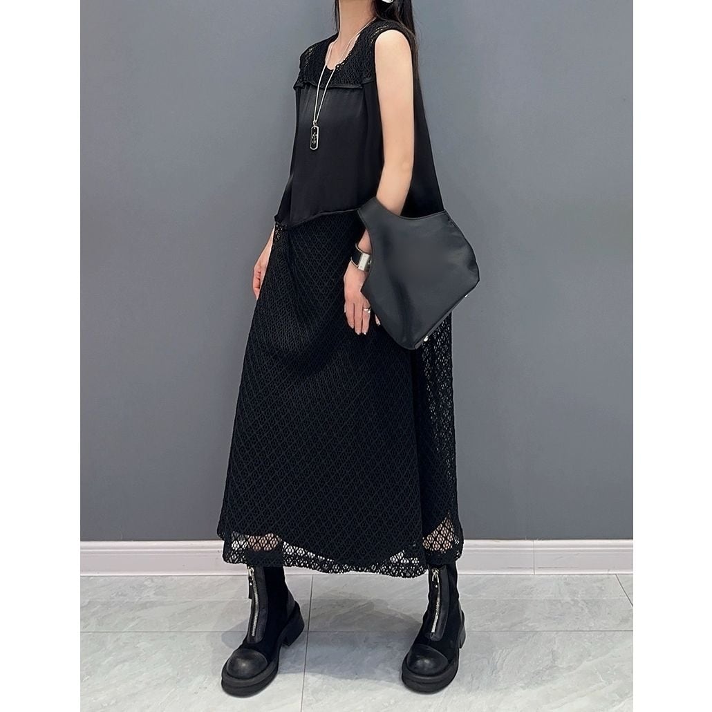SOLID MESH STITCH ROUND NECK SLEEVELESS A-LINE LONG DRESS 2colors M-9823
