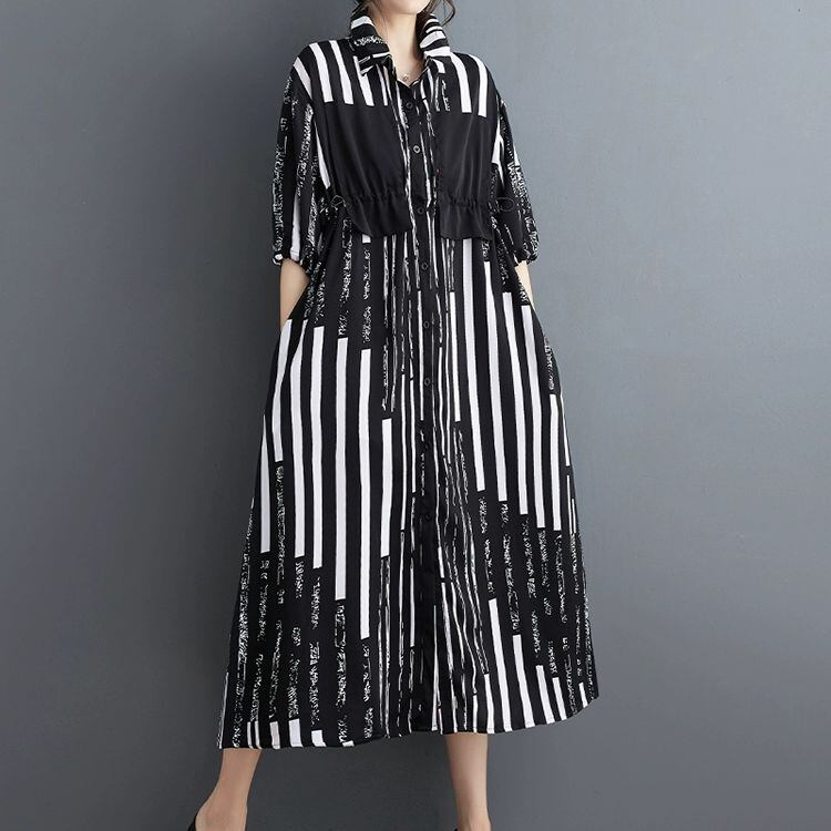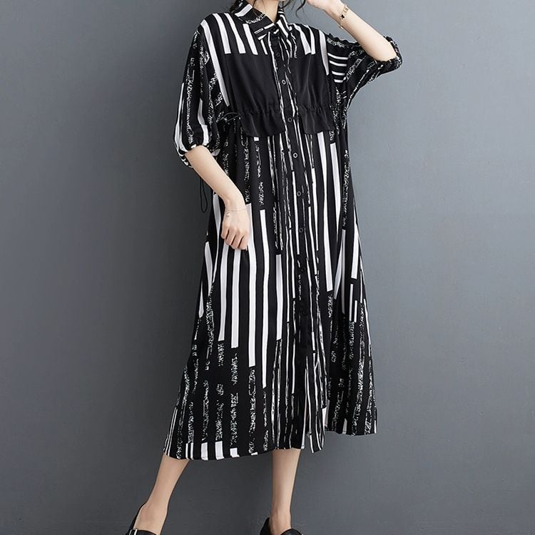 DESIGN STRIPE HALF SLEEVES A-LINE MIDI SHIRT DRESS 2colors M-9835