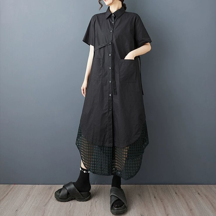 LACE HEM HALF SLEEVES A-LINE LONG SHIRT DRESS 2colors M-13549