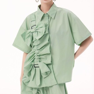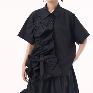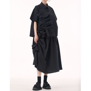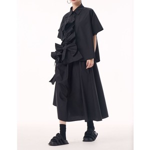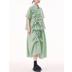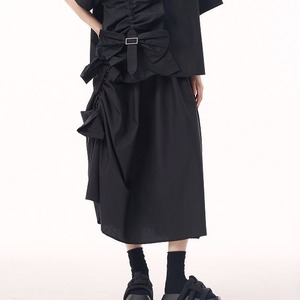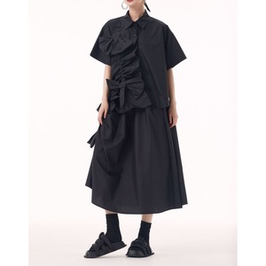 BOW FRILLED BELT TRIMMED HALF SLEEVES SHIRT & MIDI SKIRT 3colors M-13652
