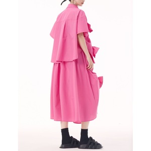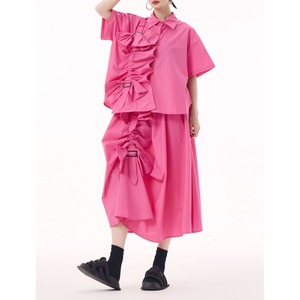 リボンやフリルの付いたベルトのモチーフがキュートな、ポロ襟・半袖・デザインシャツと膝下丈のスカートのセットアップです。上下別売りです。ゆったりふんわりしたシルエットが魅力的な、ガーリーな印象のアイテムです。全3色から選べます。
