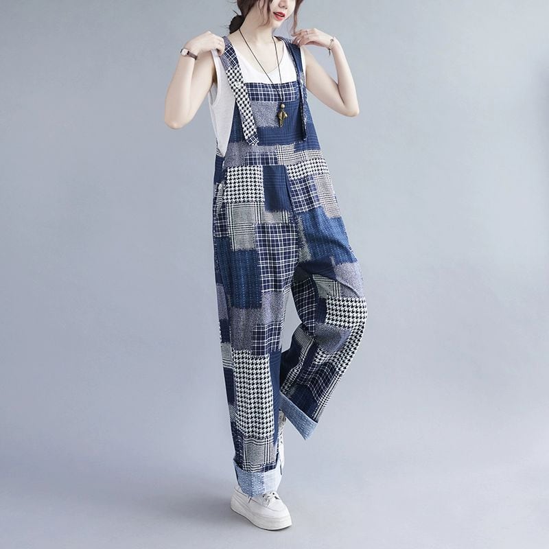 ブルーベースのパッチワークプリントがキュートな、ワイドレッグのオーバーオールです。ショルダーストラップはボタンで長さを調節できます。シンプルなインナーとの相性が良い、目を惹くカジュアルアイテムです。