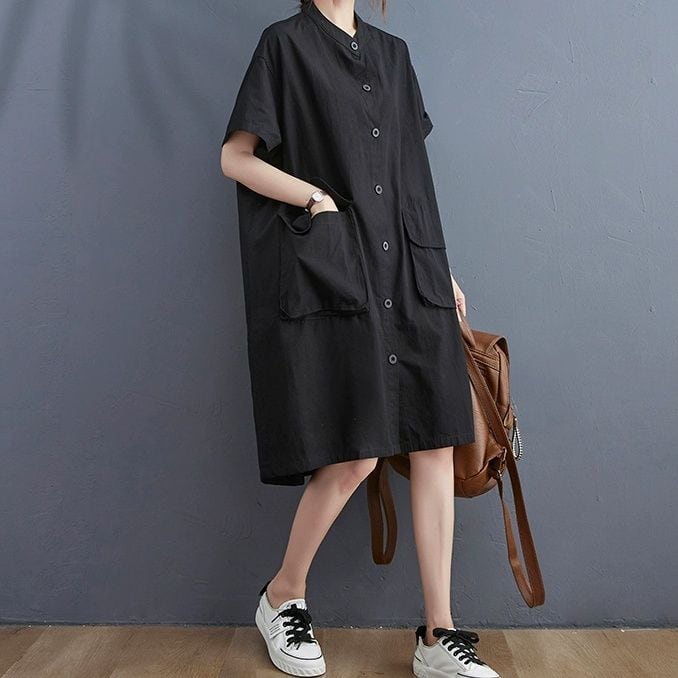 涼し気な単色素材でできた、スタンドカラー・半袖・膝丈のシャツワンピースです。大きな立体フラップポケットがアクセントになった、ワイドなAラインシルエットのカジュアルアイテムです。全3色から選べます。