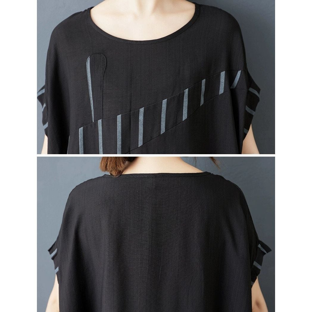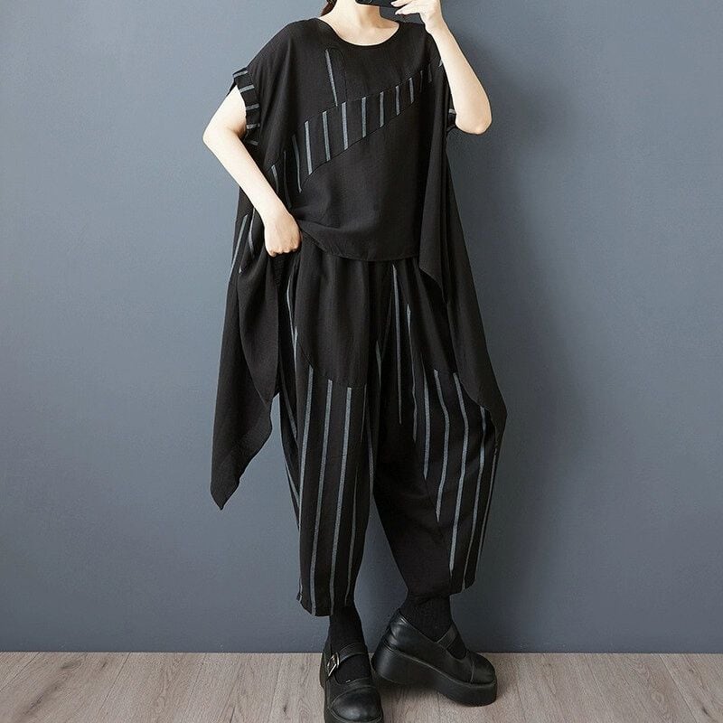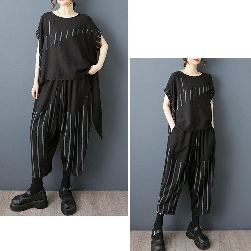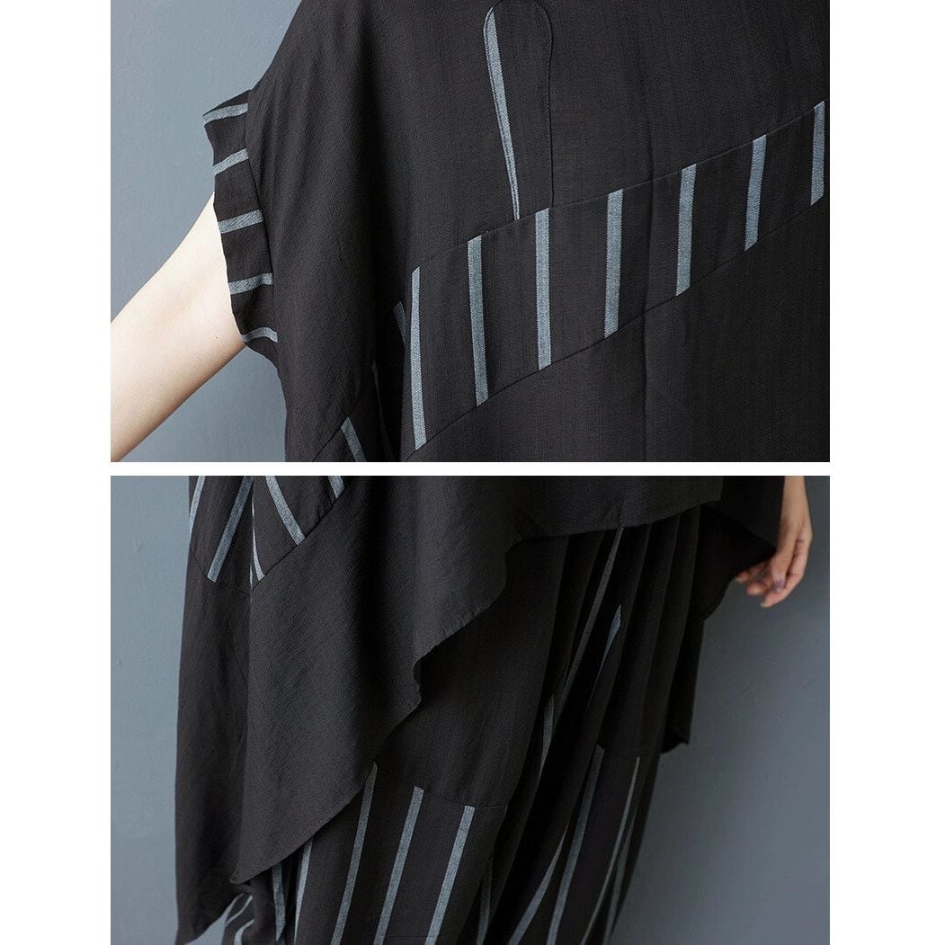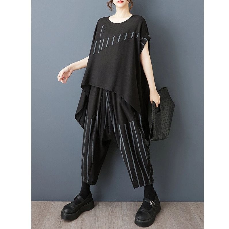 ブラックの無地とストライプ生地のスティッチデザインがお洒落な、ボートネック・半袖・イレギュラーヘムのトップスと、ワイドレッグ・クロップドパンツのセットアップです。トップスは、サイドからバックにかけて長くなった、マントのようなAラインシルエットが特徴的です。ハーレムパンツのようなボトムスは、履きこごちがよく動きやすいです。