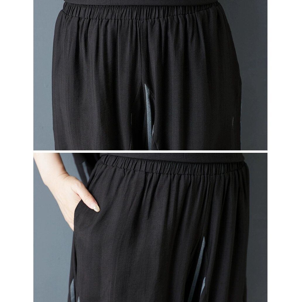 BLACK STRIPE STITCH DESIGN TOP & WIDE LEG CROPPED PANTS SET 2pieces 1color M-13906