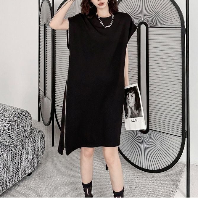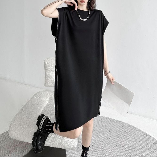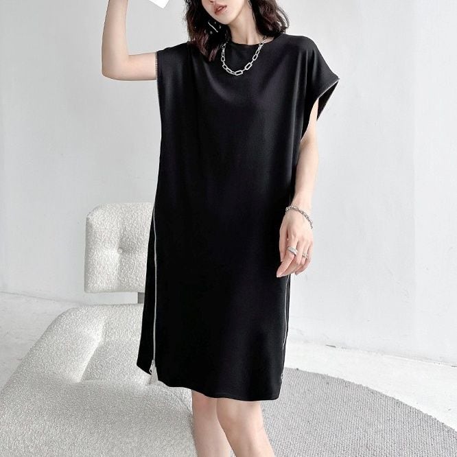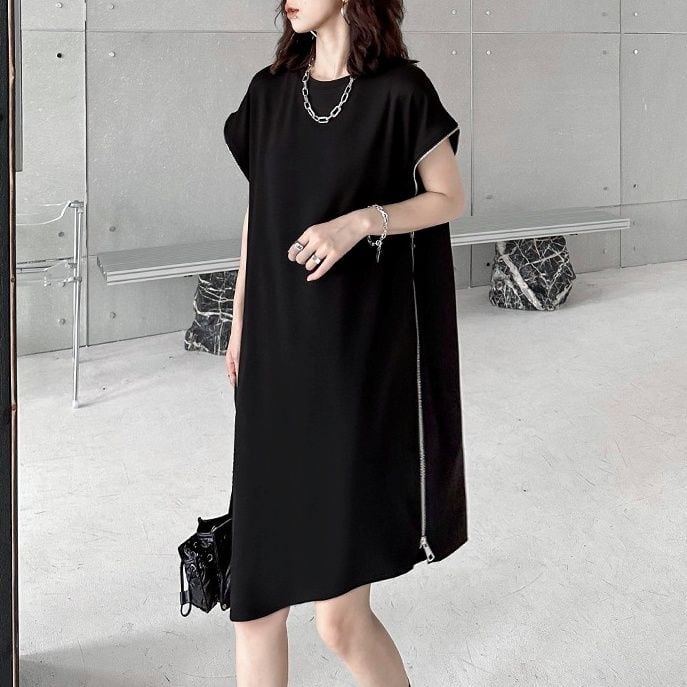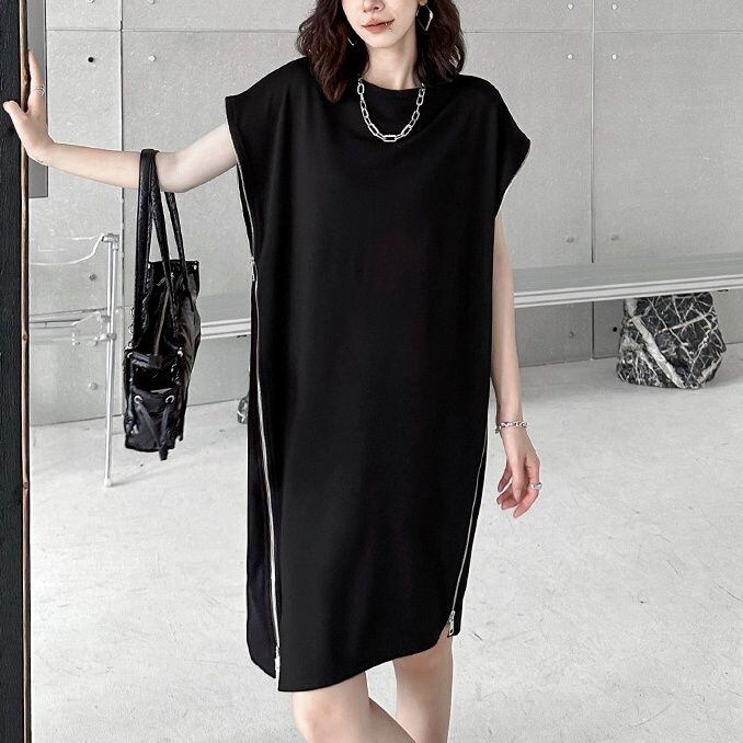 ブラックの単色にシルバーのダブルジップがクールな、ラウンドネック・フレンチスリーブ・膝丈のデザインワンピースです。袖口とサイドが繋がったシルエットがお洒落な、アクセサリーなど小物アレンジの利くアイテムです。