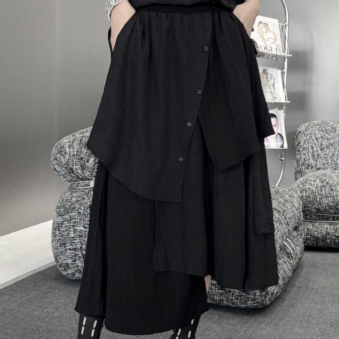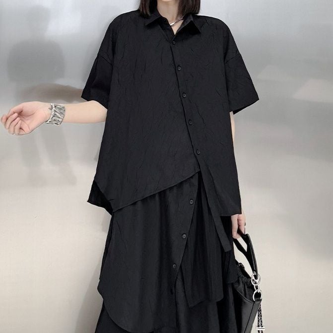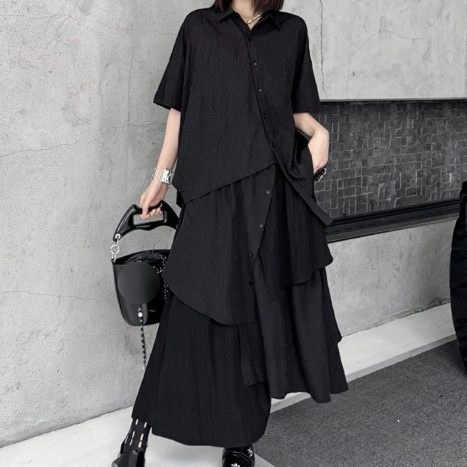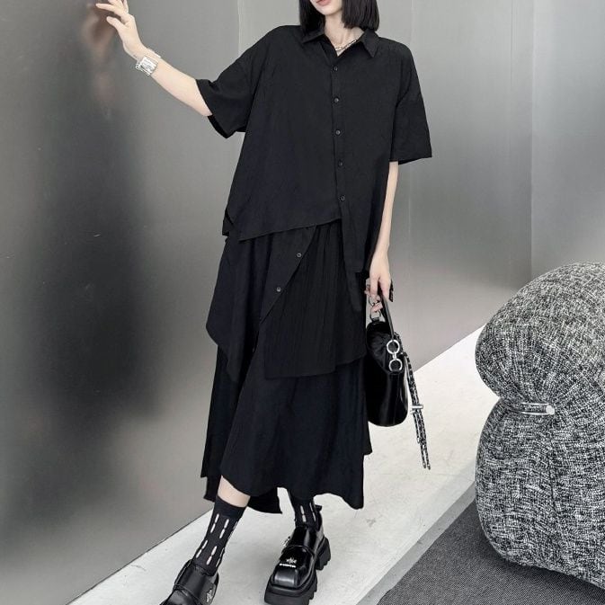 BLACK ASYMMETRIC DESIGN SHIRT & A-LINE SKIRT 1color M-13969