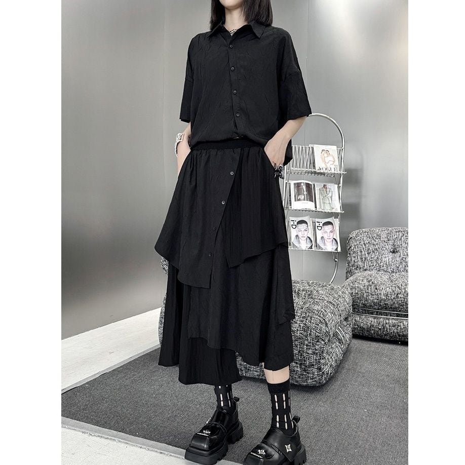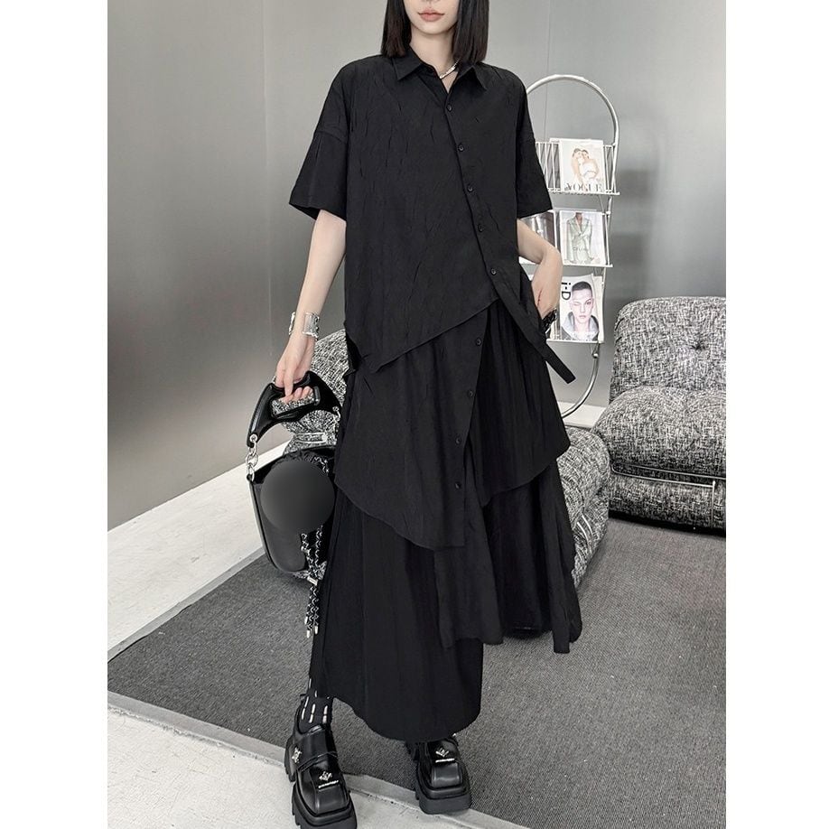 ブラックのアシンメトリックなデザインがクールな、半袖シャツとAラインスカートのセットアップです。上下別売りです。イレギュラーなレイヤーや裾のラインが特徴的な、デザイン性の高いモードな印象のアイテムです。