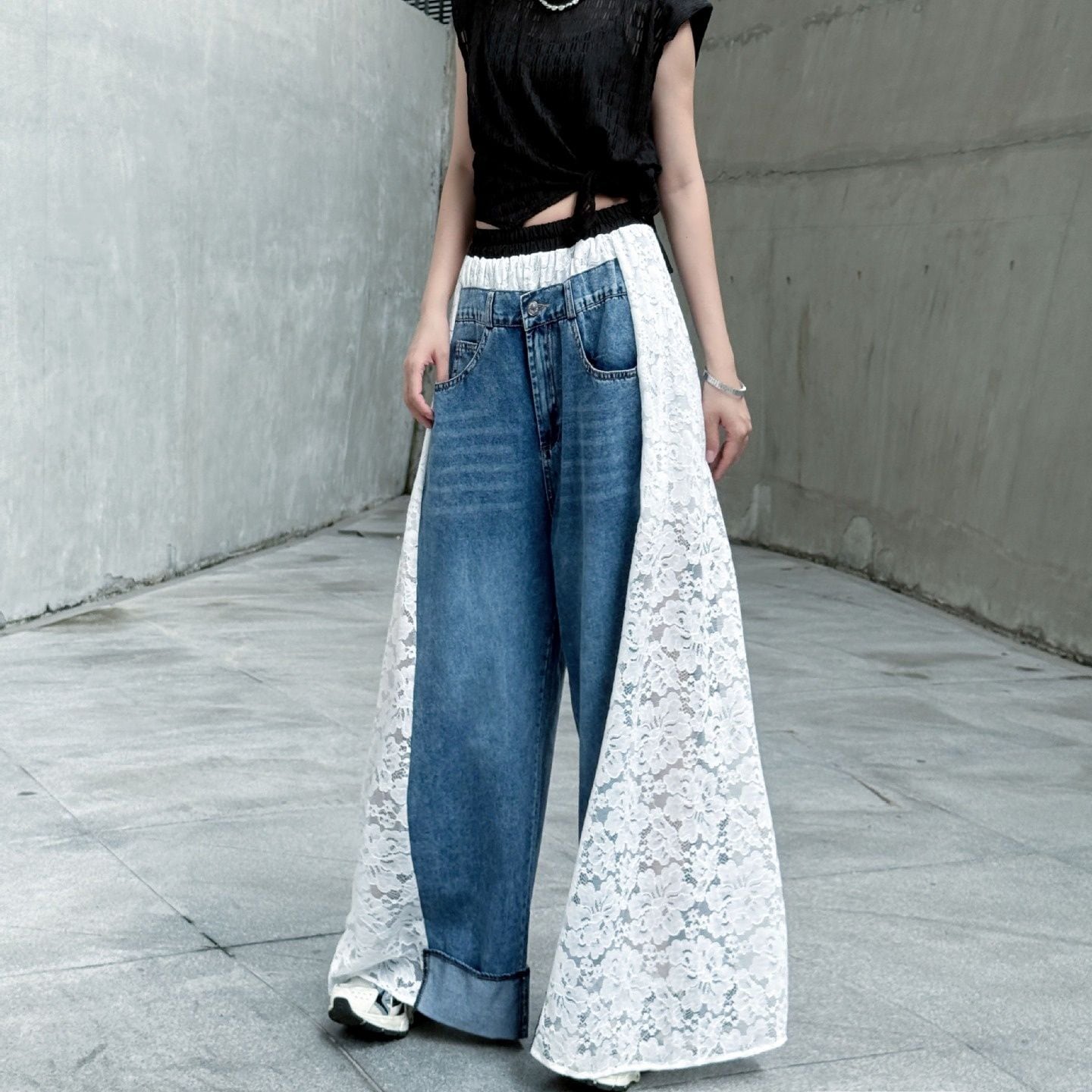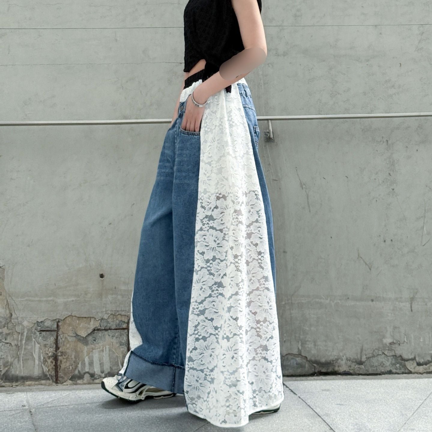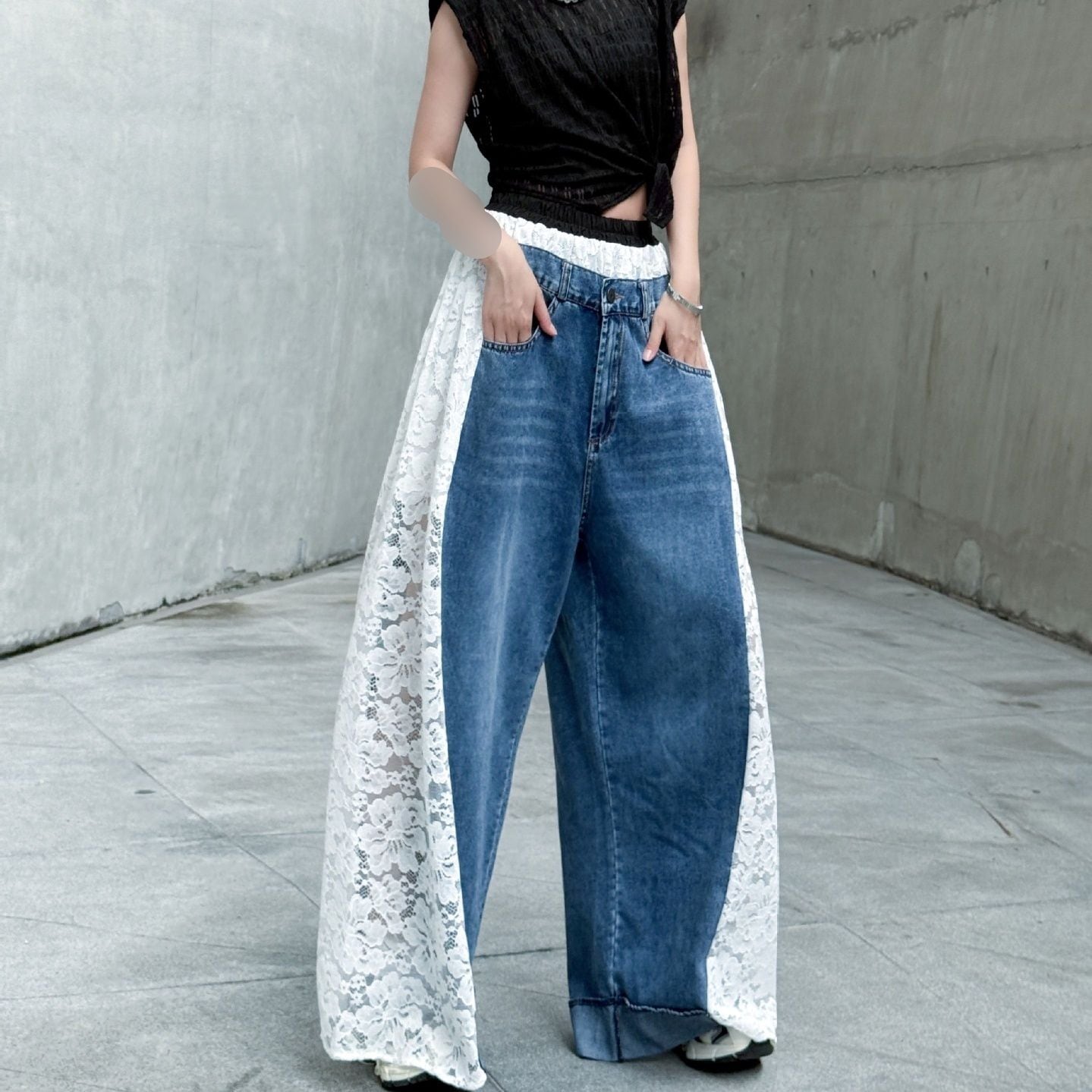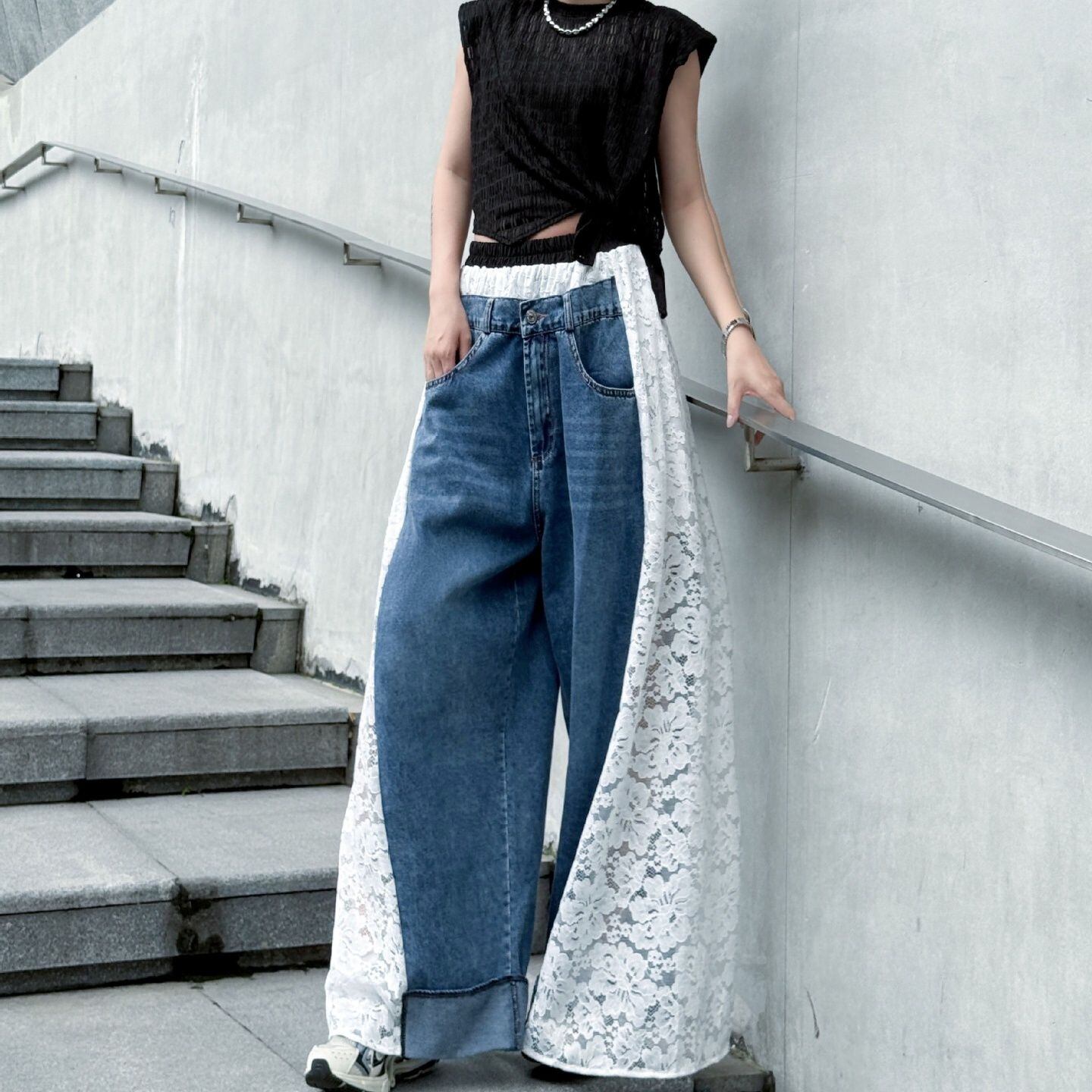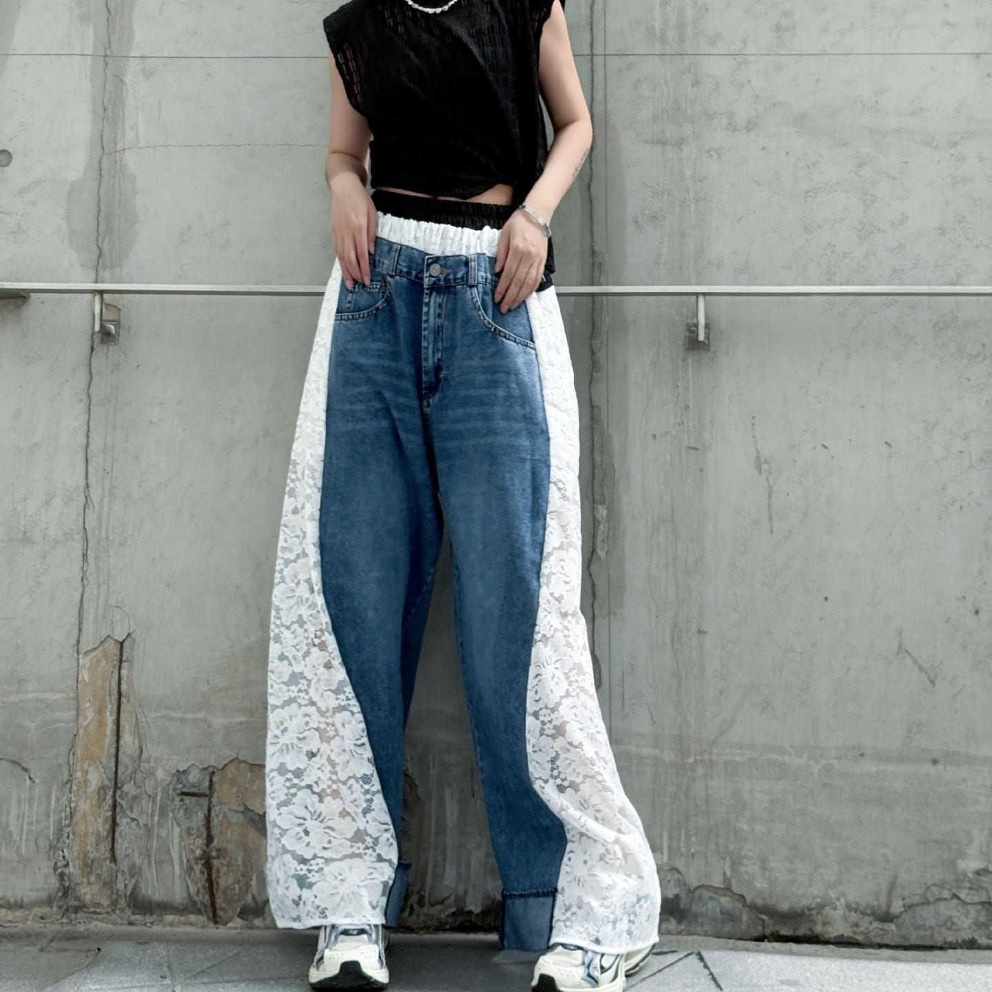 BLUE DENIM STITCHED WHITE LACE WIDE LEG PANTS 1color M-14002