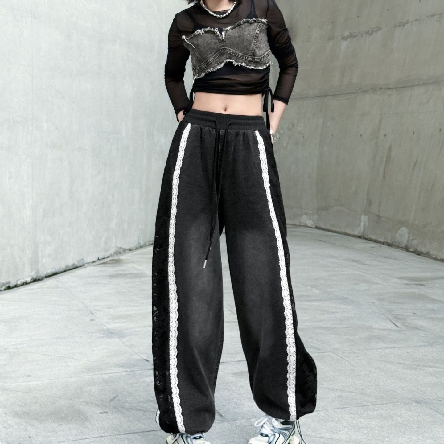 LACE STITCHED DRAW STRING WIDE LEG DENIM PANTS 2colors M-14003
