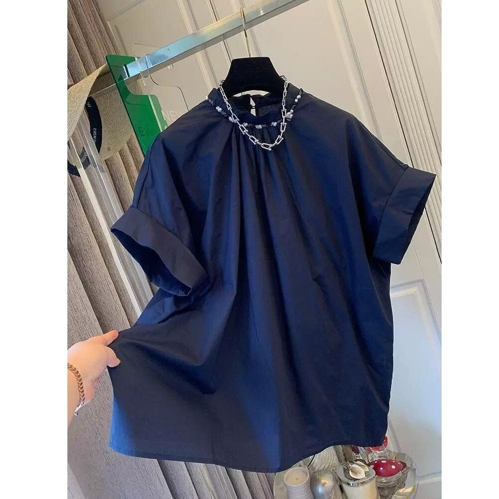 スタンドネックの周りにあしらわれたフレンチビーズの飾りがネックレスのような、半袖のプルオーバーシャツです。ネックのスリットをループボタンで留めるデザインになっています。ネックのギャザーで作られるドレープやシルエットが美しい、エレガントな印象のアイテムです。2色から選べます。 SIZE:※測り方によって2-3cmの差が生じる場合がございます。 【M】バスト105cm 着丈65cm 【L】バスト110cm 着丈66cm 【XL】バスト115cm 着丈67cm 【2XL】バスト120cm 着丈68cm COLOR:Navy、White 素材:ポリエステル、その他 お届けについて こちらの商品は海外店舗より直接発送となる為、 ご決済から到着までは、多くの場合【10日-2週間前後】でお届けしております。 ※在庫状況や輸送の混雑により、4週間前後かかる場合がございます。 注意事項 ・商品在庫切れにより注文キャンセルとさせていただく恐れもございますので、予めご了承くださいませ。 ・仕入れ工場を変えることがあるため、記載サイズと若干異なる場合がございます。 ・商品の色味は、お手持ちのスマートフォンの画面によって実物と若干異なる場合がございます。 ・イメージ違いやサイズ交換等、お客さまご都合による交換・返品はご遠慮ください。 送料について 全国一律580円。ただし10,000円以上のご注文で送料無料となります。 お支払い方法について ・クレジットカード決済(VISA/Mastercard/JCB/アメリカン・エクスプレス/ Diners Club) ・コンビニ決済/Pay-easy ※前払いのお支払い方法 ・あと払い(Pay ID) ・キャリア決済(docomo/au/ソフトバンク/Y!mobile) 管理番号:M-14022