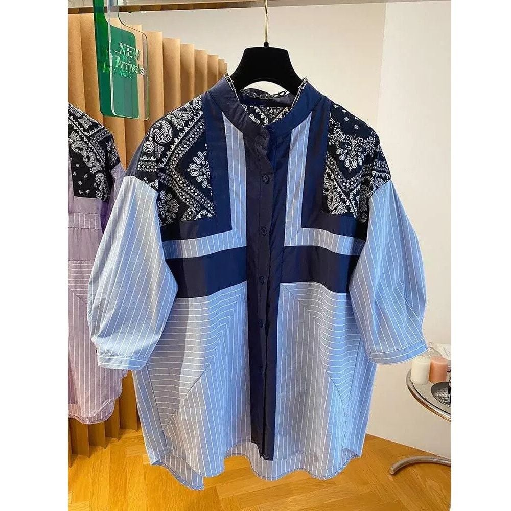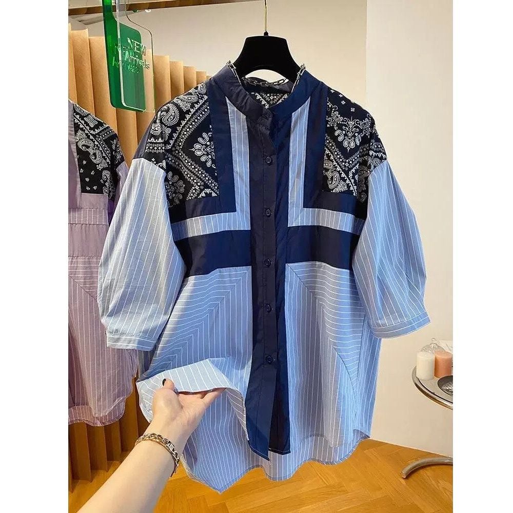 ライトブルーのストライプ素材にネイビーやペイズリー柄のスティッチが目を惹く、スタンドカラー・5分袖・デザインシャツです。ランタンのように膨らんだ袖や短めの丈のシルエットが魅力的な、コーディネートの主役になるアイテムです。 SIZE:※測り方によって2-3cmの差が生じる場合がございます。 【M】バスト105cm 着丈75cm 【L】バスト110cm 着丈76cm 【XL】バスト115cm 着丈77cm 【2XL】バスト120cm 着丈78cm COLOR:Blue 素材:ポリエステル60%、綿40% お届けについて こちらの商品は海外店舗より直接発送となる為、 ご決済から到着までは、多くの場合【10日-2週間前後】でお届けしております。 ※在庫状況や輸送の混雑により、4週間前後かかる場合がございます。 注意事項 ・商品在庫切れにより注文キャンセルとさせていただく恐れもございますので、予めご了承くださいませ。 ・仕入れ工場を変えることがあるため、記載サイズと若干異なる場合がございます。 ・商品の色味は、お手持ちのスマートフォンの画面によって実物と若干異なる場合がございます。 ・イメージ違いやサイズ交換等、お客さまご都合による交換・返品はご遠慮ください。 送料について 全国一律580円。ただし10,000円以上のご注文で送料無料となります。 お支払い方法について ・クレジットカード決済(VISA/Mastercard/JCB/アメリカン・エクスプレス/ Diners Club) ・コンビニ決済/Pay-easy ※前払いのお支払い方法 ・あと払い(Pay ID) ・キャリア決済(docomo/au/ソフトバンク/Y!mobile) 管理番号:M-14028