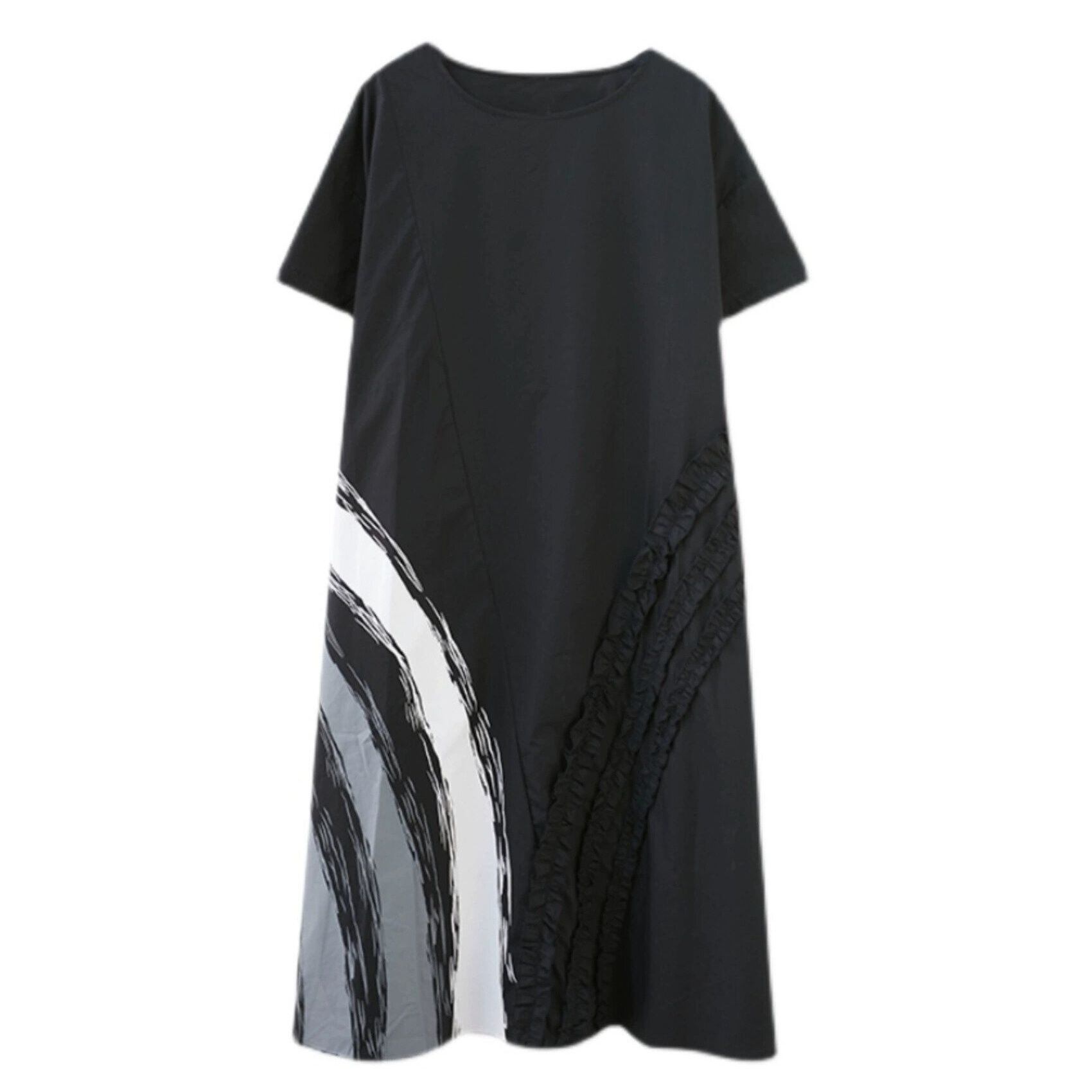 フリルリボンやペイントラインのプリントがお洒落な、ボートネック・半袖・ミドル丈・プルオーバーワンピースです。ブラックベースのクールな印象で、アクセサリーなど小物アレンジの利くアイテムです。