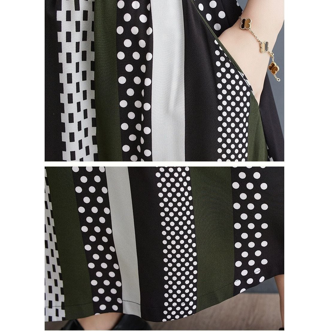 モノトーンのパッチワークストライプがお洒落な、ワイドレッグ・クロップドパンツです。ウエストはゴムなので、着脱が簡単で履き心地が良いです。アシンメトリックなデザインとスカートのようなAラインが魅力的な、カジュアルアイテムです。