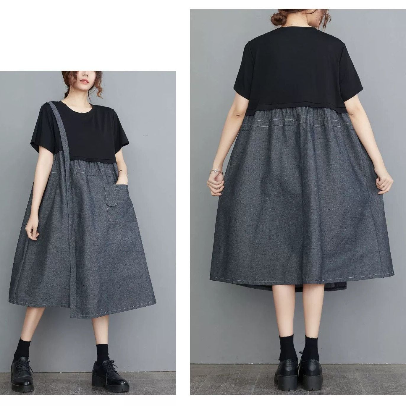 ブラックとデニムのコントラストスティッチデザインがお洒落な、ラウンドネック・半袖・ミドル丈のプルオーバーワンピースです。右肩からのラインの左右でスティッチをずらしたアシンメトリックなデザインが特徴的な、ゆったりとしたシルエットのカジュアルアイテムです。