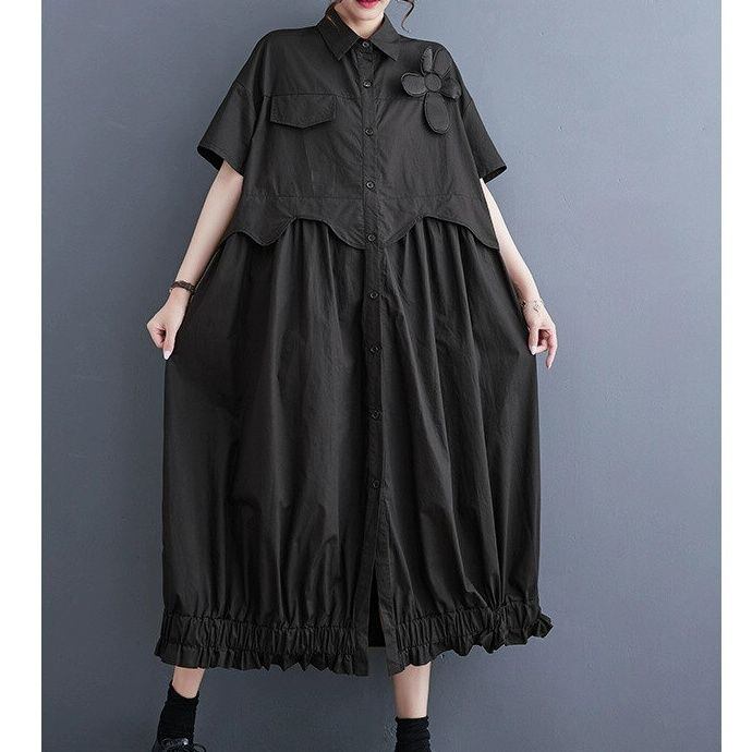左肩の立体フラワーモチーフがアクセントになった、ポロ襟・半袖・膝下丈のデザインシャツワンピースです。ウエストのスティッチラインや裾をギャザーしたランタンのようなシルエットが特徴的な、可愛らしい印象のアイテムです。ブラックとホワイトの2色から選べます。