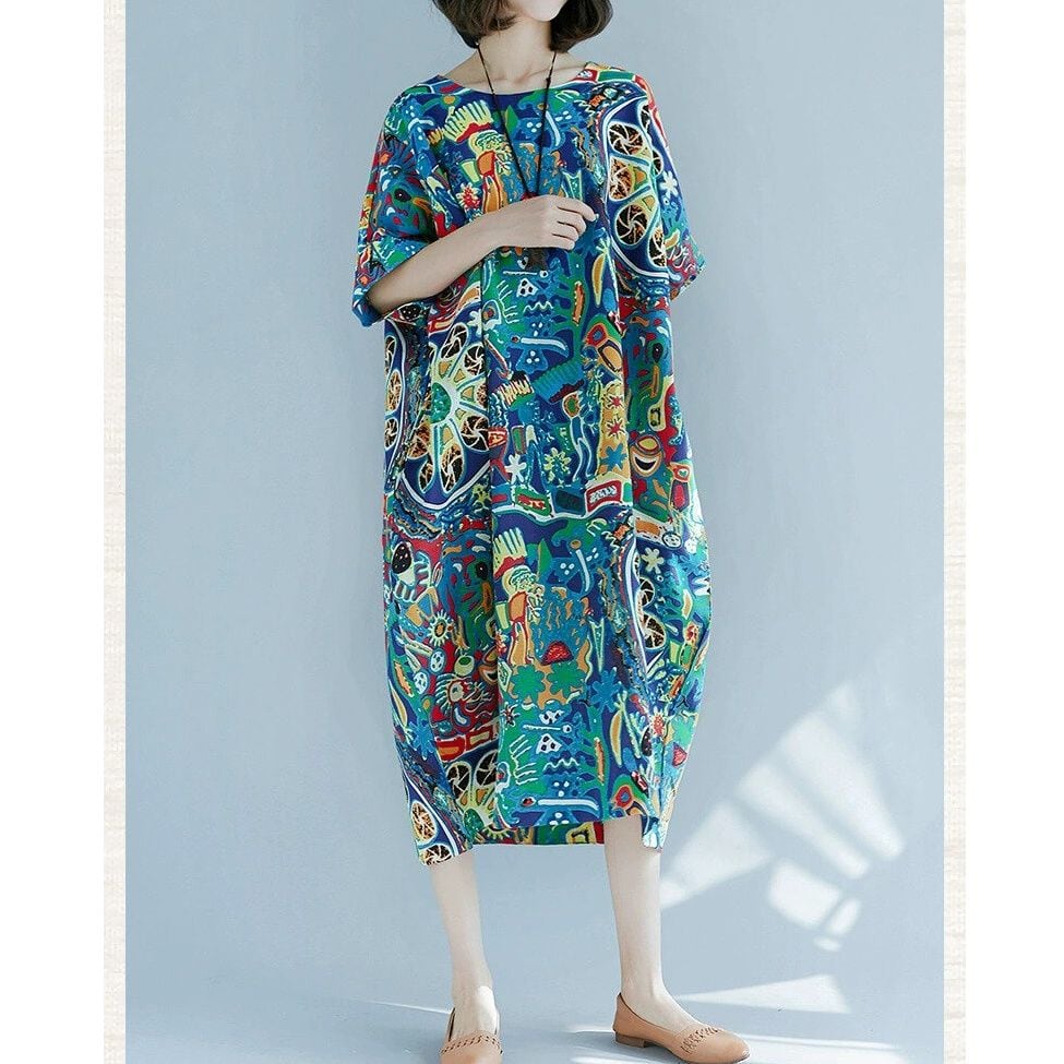ブルーを基調としたカラフルなエスニック柄が魅力的な、ボートネック・半袖・ミドル丈のプルオーバーワンピースです。コクーンのようなシルエットがキュートな、ゆったりとしてリラックスした印象のカジュアルアイテムです。