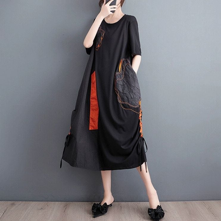 オレンジとブラックのコントラストデザインがクールな、ボートネック・半袖・ミドル丈のプルオーバーワンピースです。アーティスティックなスティッチや、ドローストリングでアレンジできるシルエットが魅力的なアイテムです。
