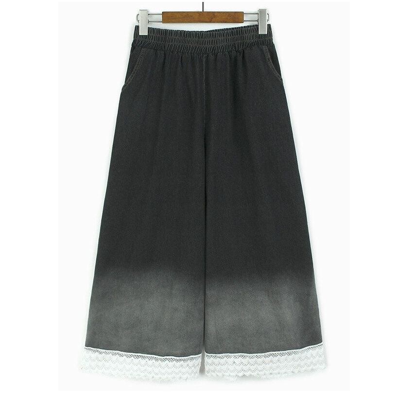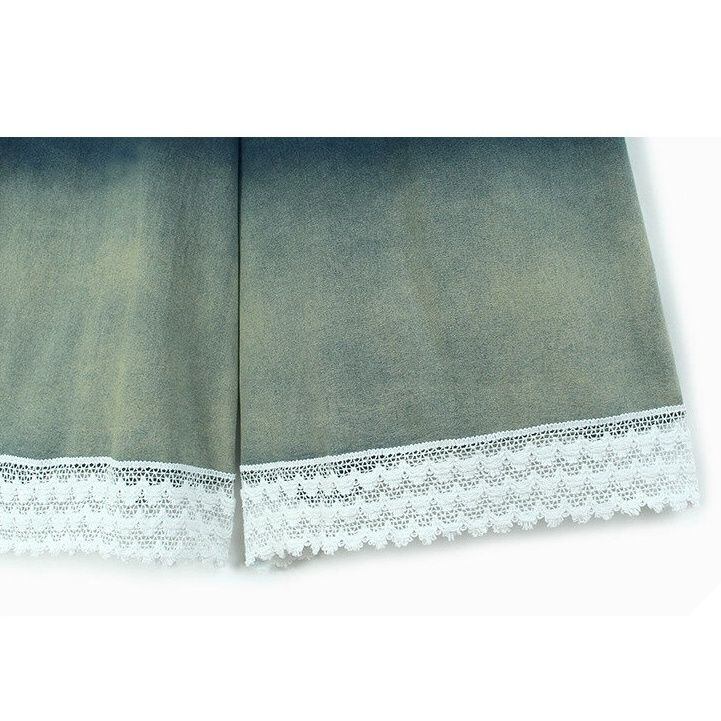 グラデーションや裾のレースリボンがお洒落な、ワイドレッグ・デニムパンツです。ウエストはゴムなので、着脱が簡単で履き心地が良いです。スカートのようなAラインのシルエットが魅力的な、合わせやすいアイテムです。2色から選べます。