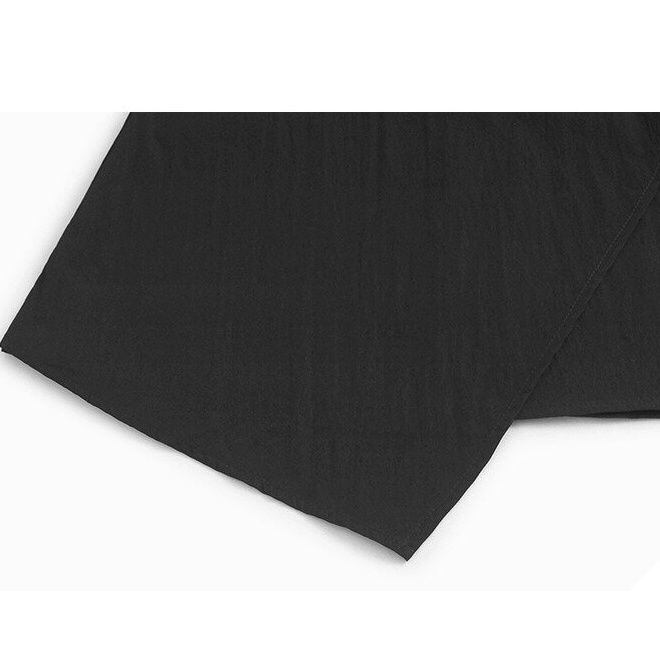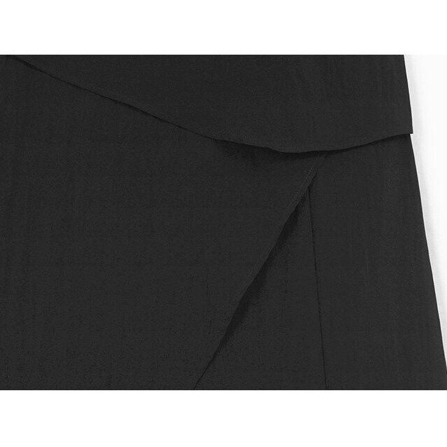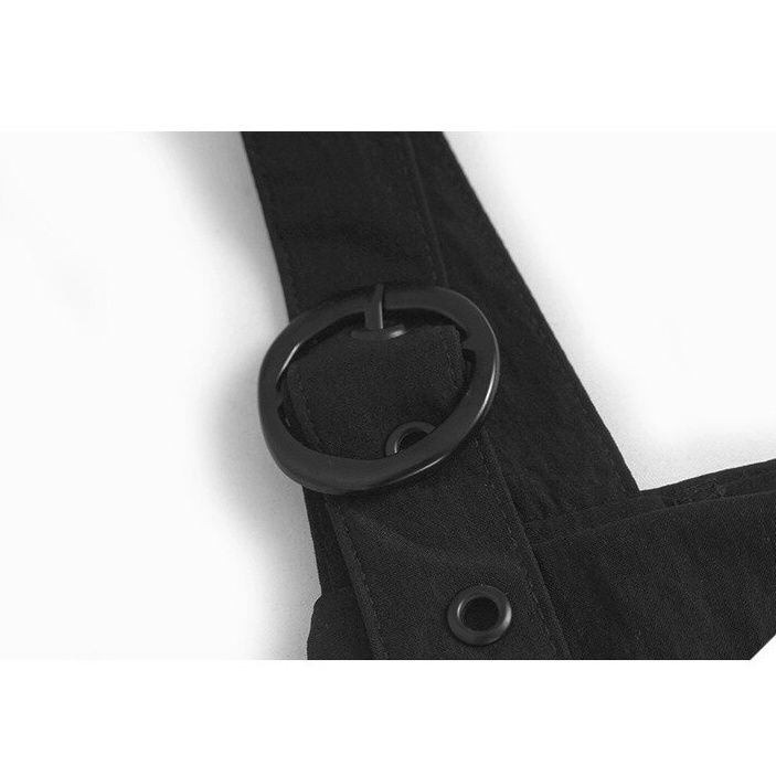フラップが作るシルエットが特徴的な、ミドル丈のジャンパースカートです。ショルダーストラップはバックル付きで、長さを調節できます。オールブラックのシンプルなデザインがクールな、合わせやすいカジュアルアイテムです。