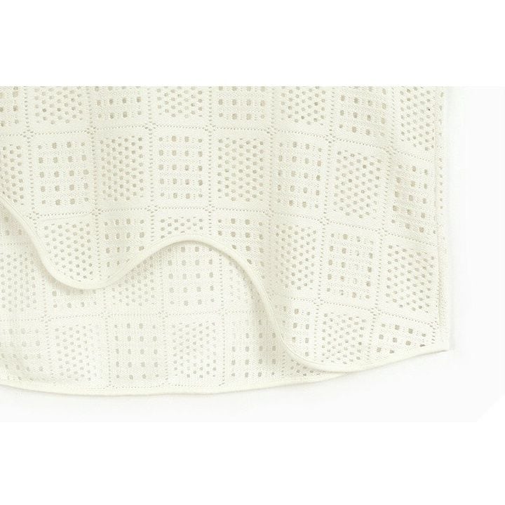 メッシュのパッチワークがキュートな、Vネックのプルオーバー・ニットベストです。ウェーブのイレギュラーな裾が特徴的な、単色で使いやすいカジュアルアイテムです。ブラックとホワイトの2色から選べます。