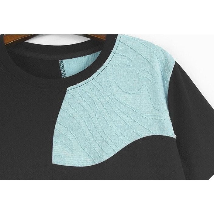 凹凸柄のライトブルーのスティッチが目を惹く、ラウンドネックのデザインTシャツです。コントラストデザインがお洒落な、コーディネートのアクセントになるカジュアルアイテムです。ブラックとホワイトの2色から選べます。