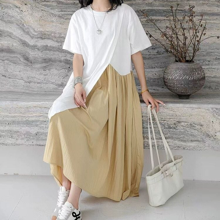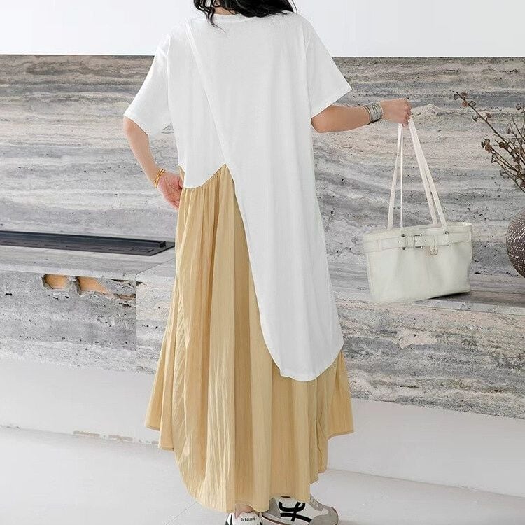 FAKE-2-PIECE ASYMMETRIC ROUND NECK HALF SLEEVES LONG PULLOVER DRESS 2colors M-14042
