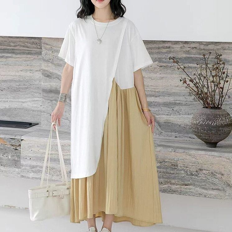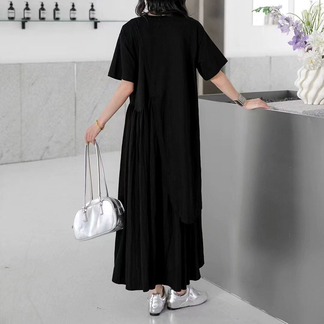 アシンメトリックなロングラインTシャツとロング丈のギャザースカートを合わせたようなフェイクツーピースデザインがお洒落な、ラウンドネック・半袖・ロング丈のプルオーバーワンピースです。ゆったりとしたシルエットがリラックスした印象の、カジュアルアイテムです。