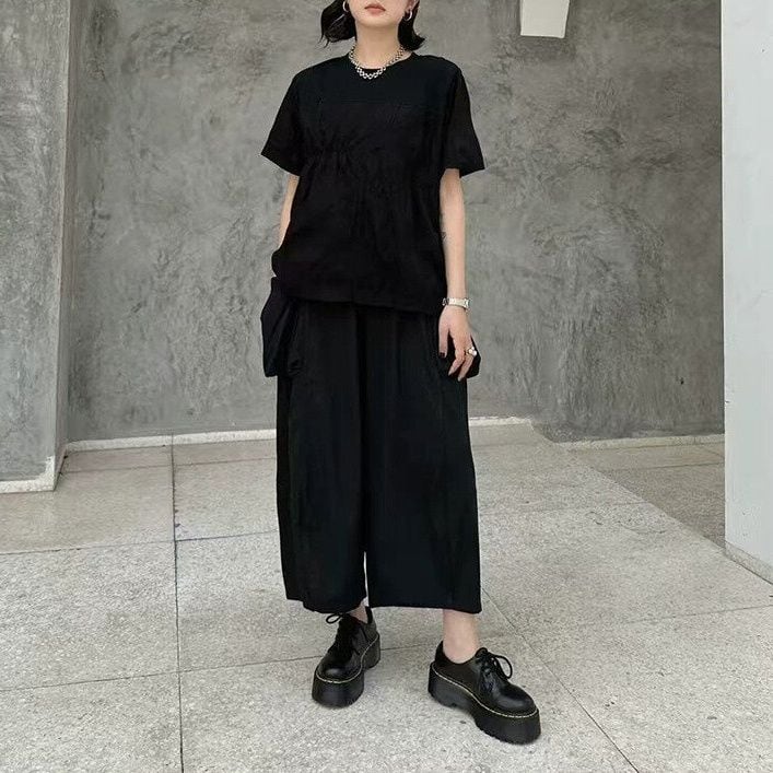 SOLID SHIRRING DESIGN ROUND NECK T-SHIRT 2colors M-14051