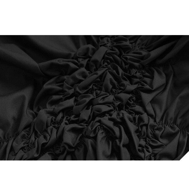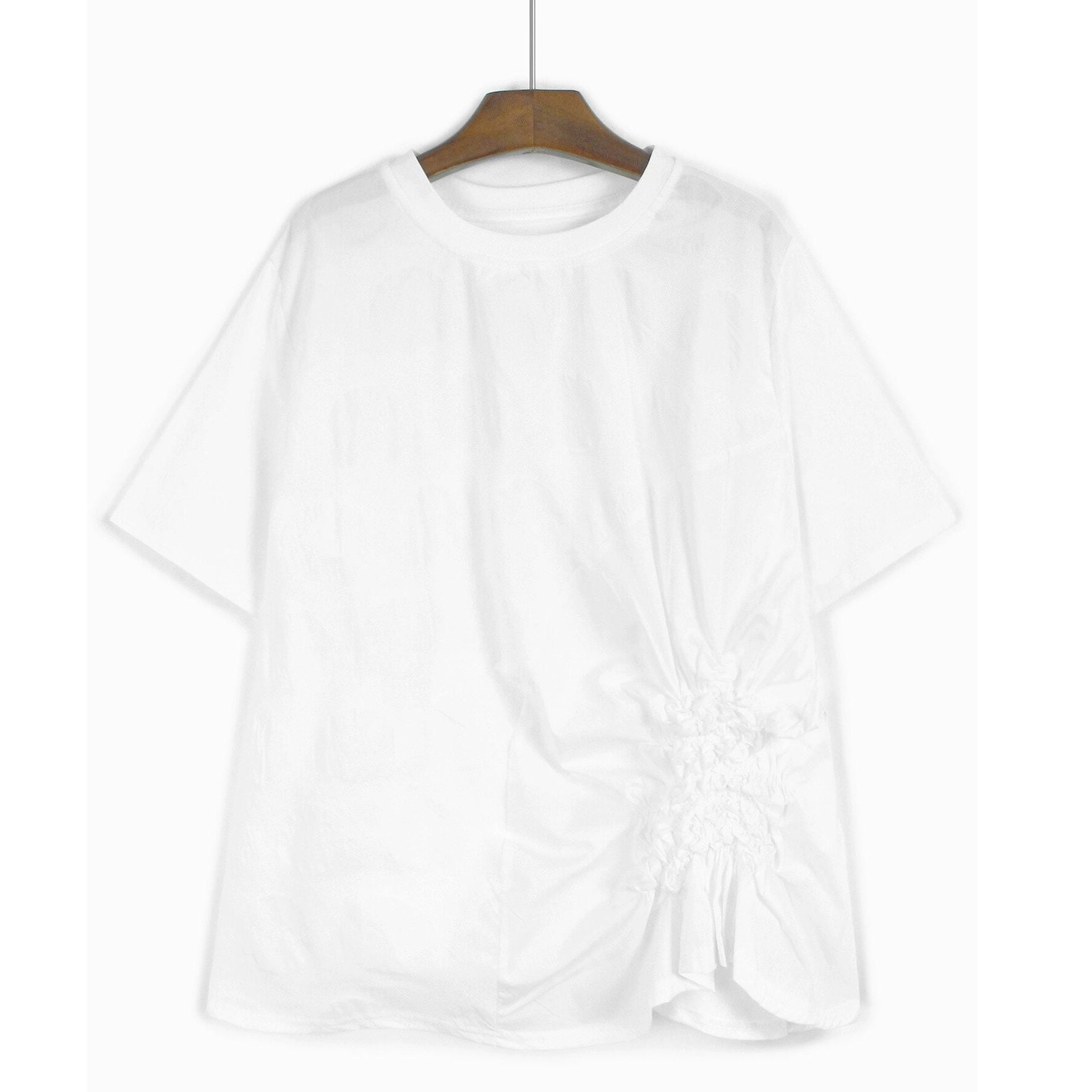 同色のドット柄メッシュのスティッチがお洒落な、ラウンドネック・デザインTシャツです。シャーリングとスティッチで作られた左裾のお花のモチーフがアクセントになった、単色で何にでも合わせやすいアイテムです。ブラックとホワイトの2色から選べます。