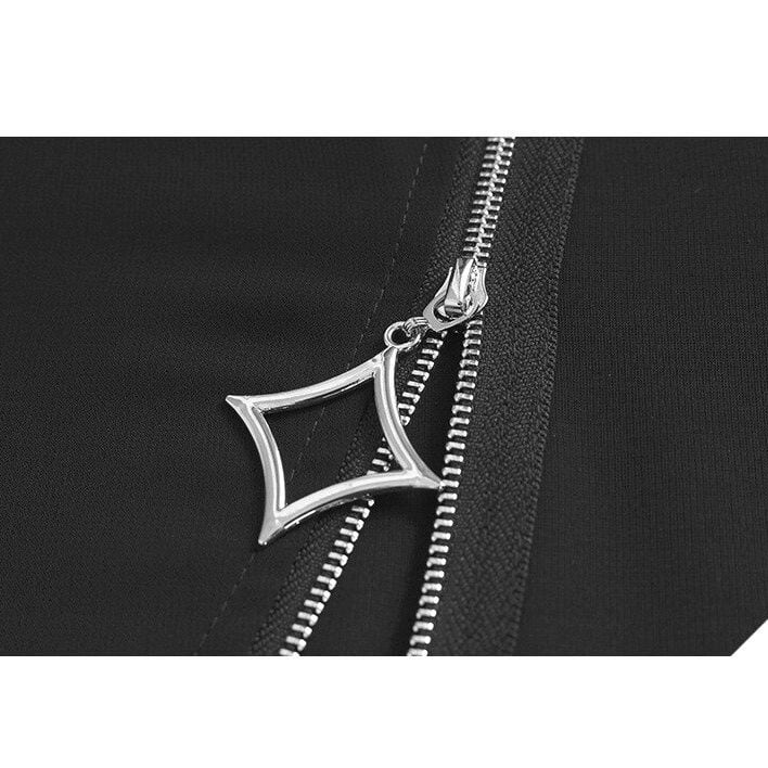 チャームの付いた斜めのジップラインがアクセントになった、ラウンドネック・ロングライン・デザインTシャツです。透け感のある素材のスティッチがお洒落で涼し気な、ブラックでクールな印象のカジュアルアイテムです。