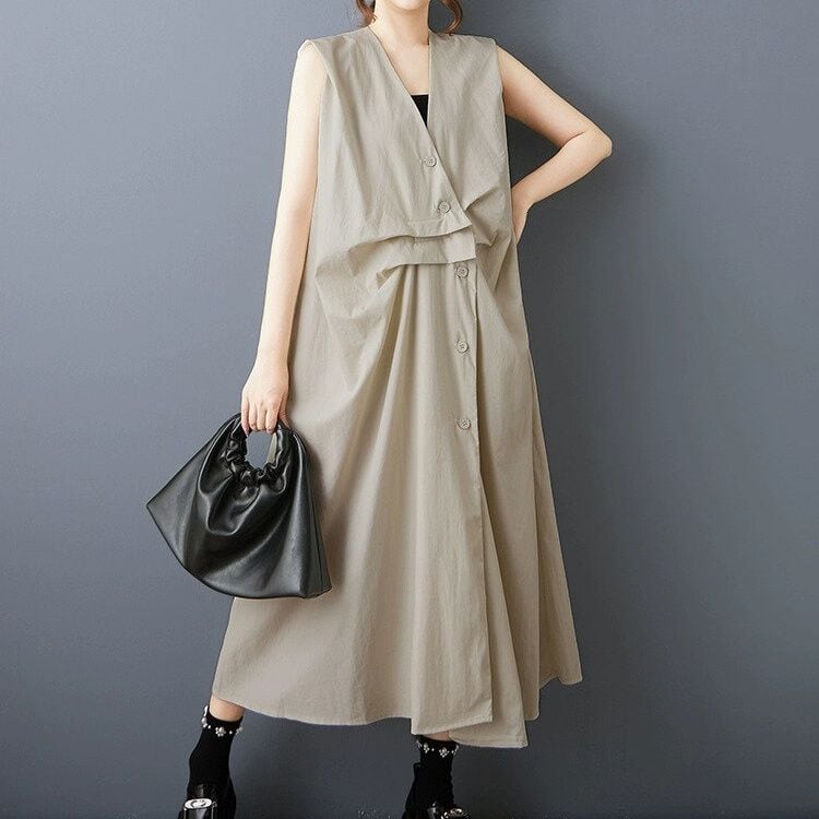 SOLID V-NECK SLEEVELESS A-LINE MIDI SHIRT DRESS 2colors M-14147