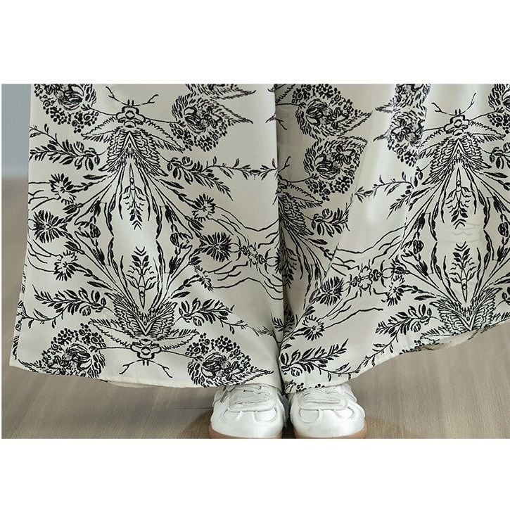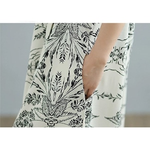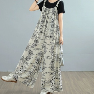モノトーンのアーティスティックなプリント生地がお洒落な、Aライン・ワイドレッグ・ジャンプスーツです。ショルダーストラップはボタンで長さを調節できます。マキシ丈のワンピースのようなシルエットが、エレガントでリラックスした雰囲気のアイテムです。